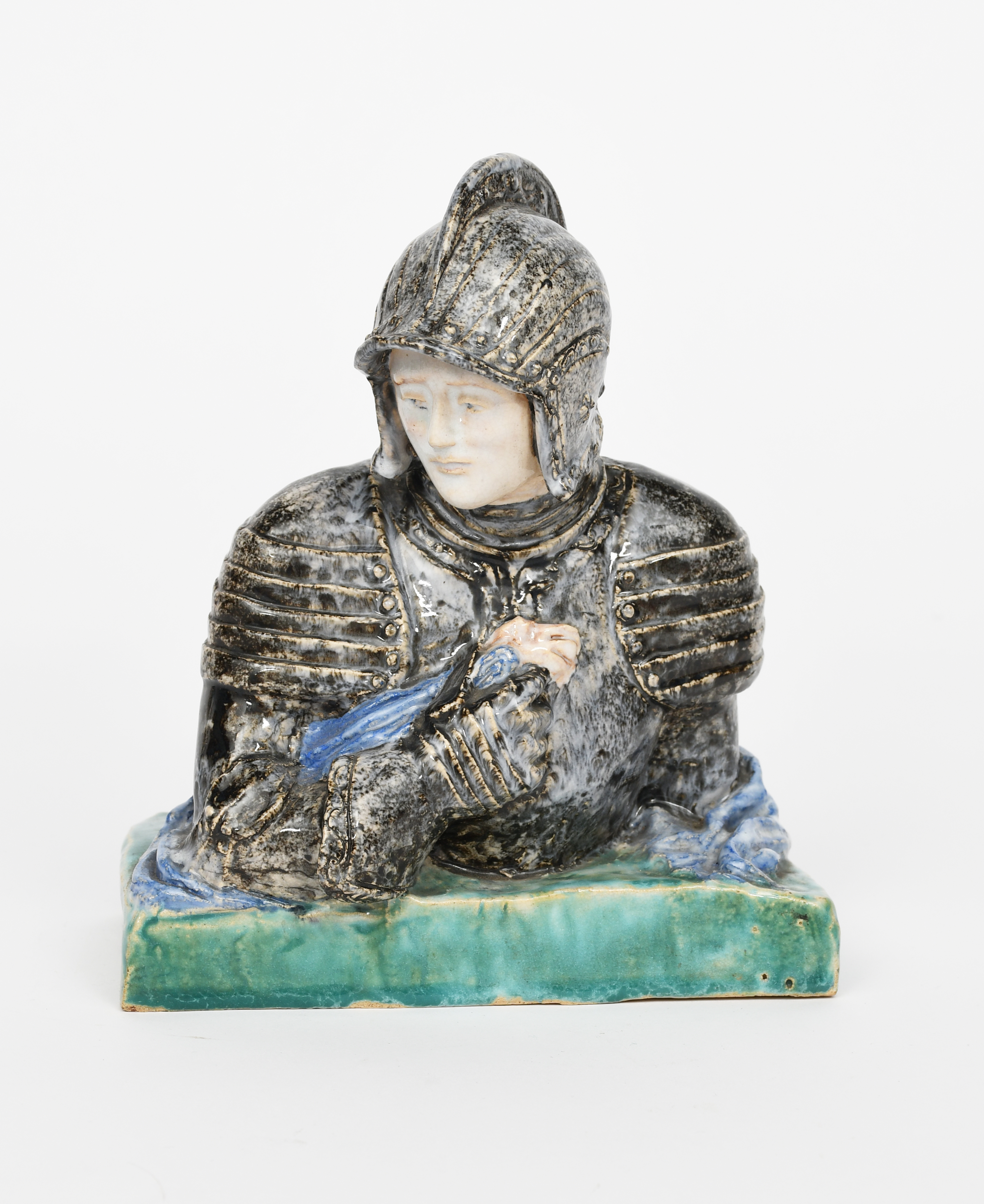 A pottery bust of a knight in armour, the young knight holding a keepsake to his chest and casting a downward glance, glazed in colours, apparently unsigned, 21cm. high