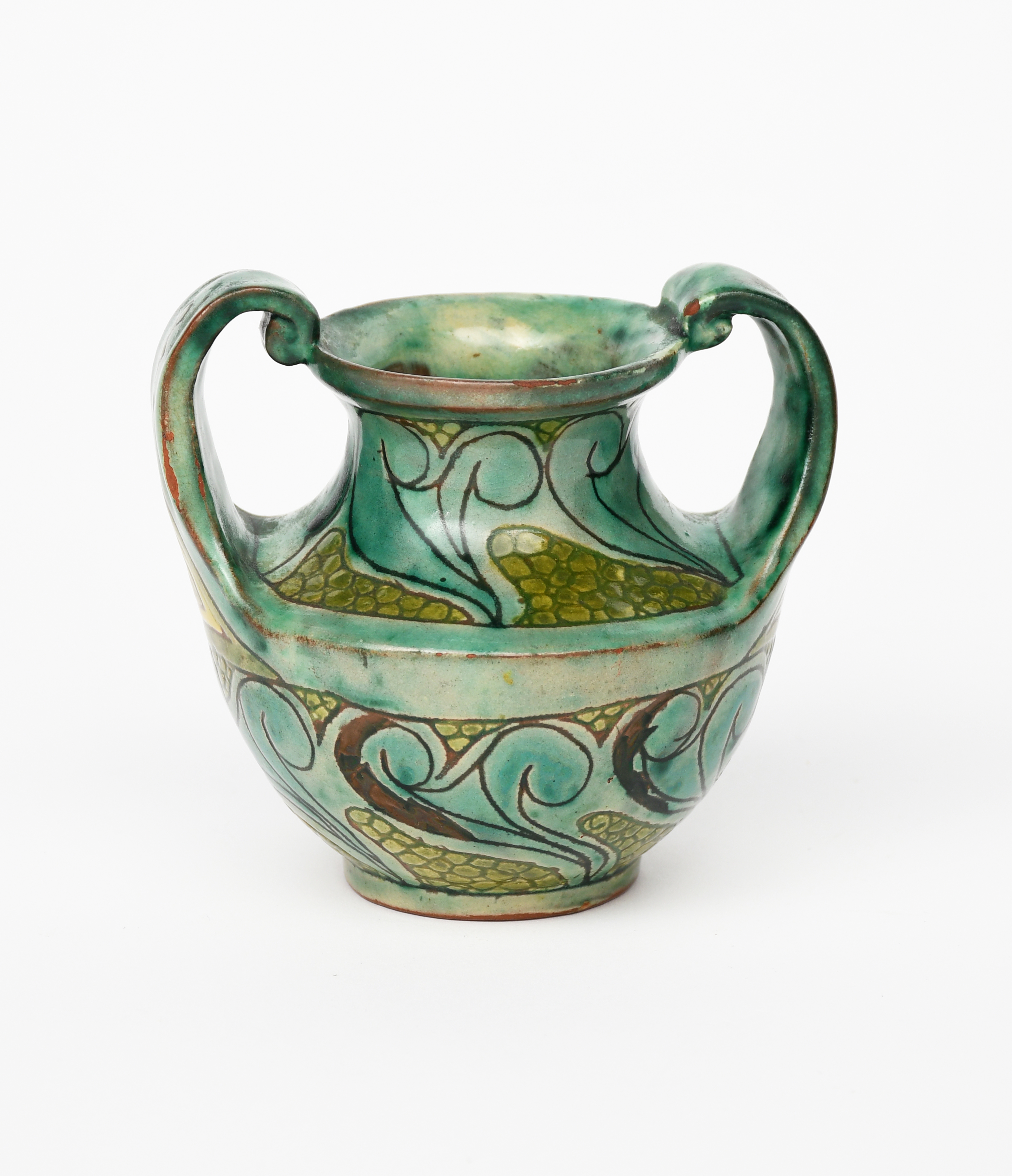 A Della Robbia Pottery vase by EJ, dated 1901, shouldered form with pulled handles, incised and painted with scrolling bands in yellow, green and turquoise incised factory mark, dated and monogrammed EJ, 11.5cm. high