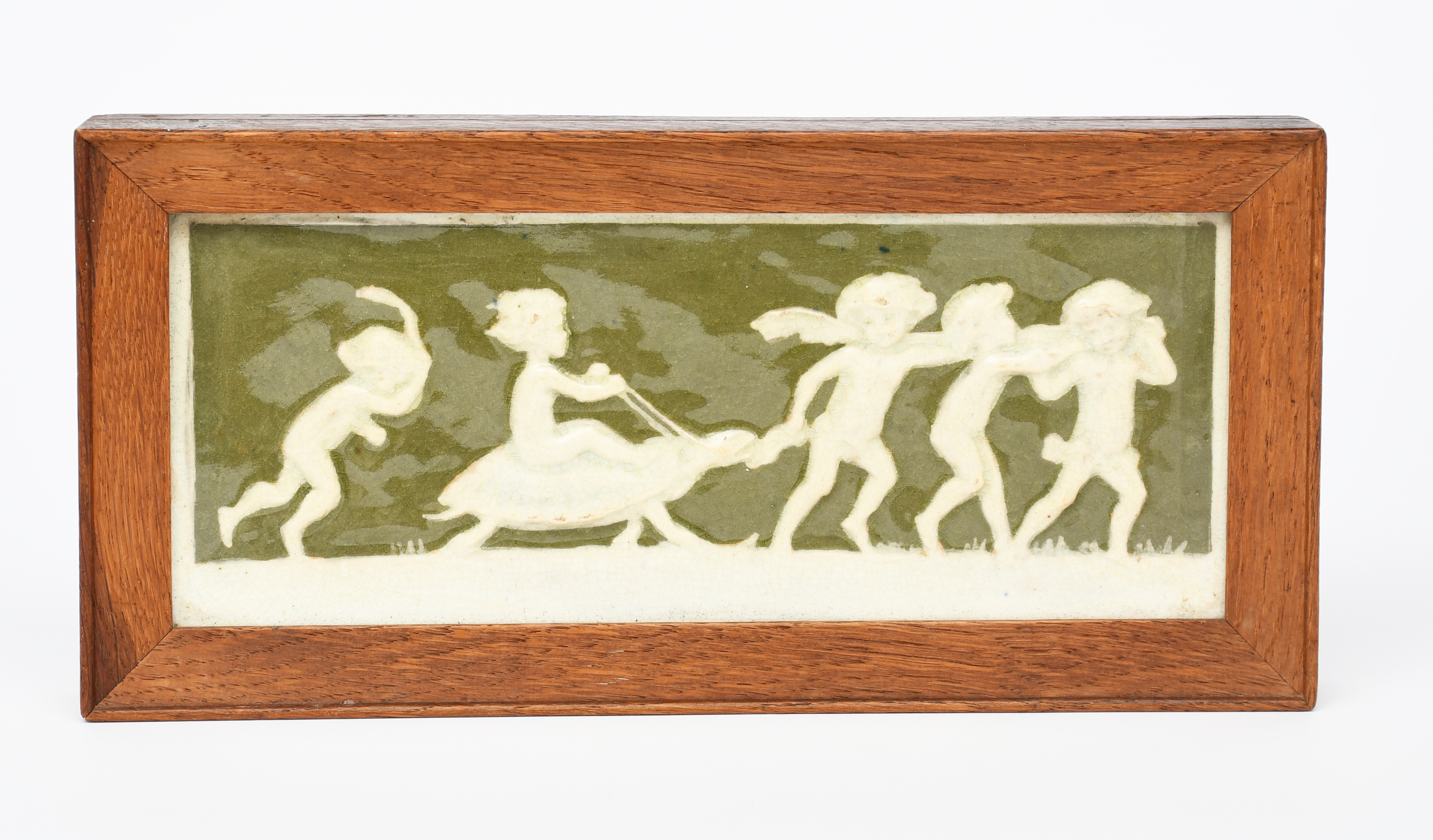 A Della Robbia pottery plaque designed by Ellen Mary Rope, modelled in low relief with a child riding a tortoise, glazed in white and olive green, in wooden frame, incised marks to back, 25 x 10cm. (plaque)