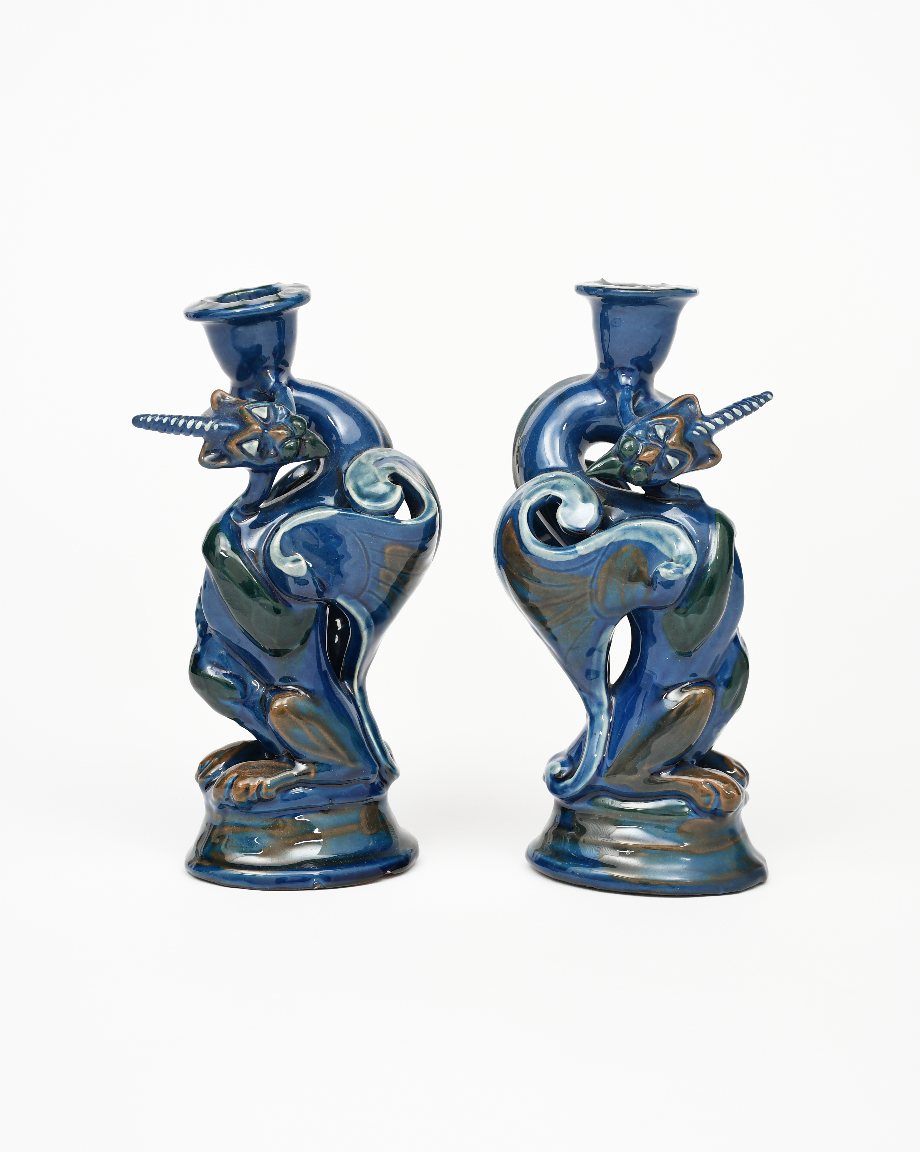 A pair of C.H. Brannam Barum pottery grotesque candlesticks, each modelled as a horned, winged beast, glazed in shades of blue and green unmarked, restored horns, chip to base rim, 20cm. high (2)