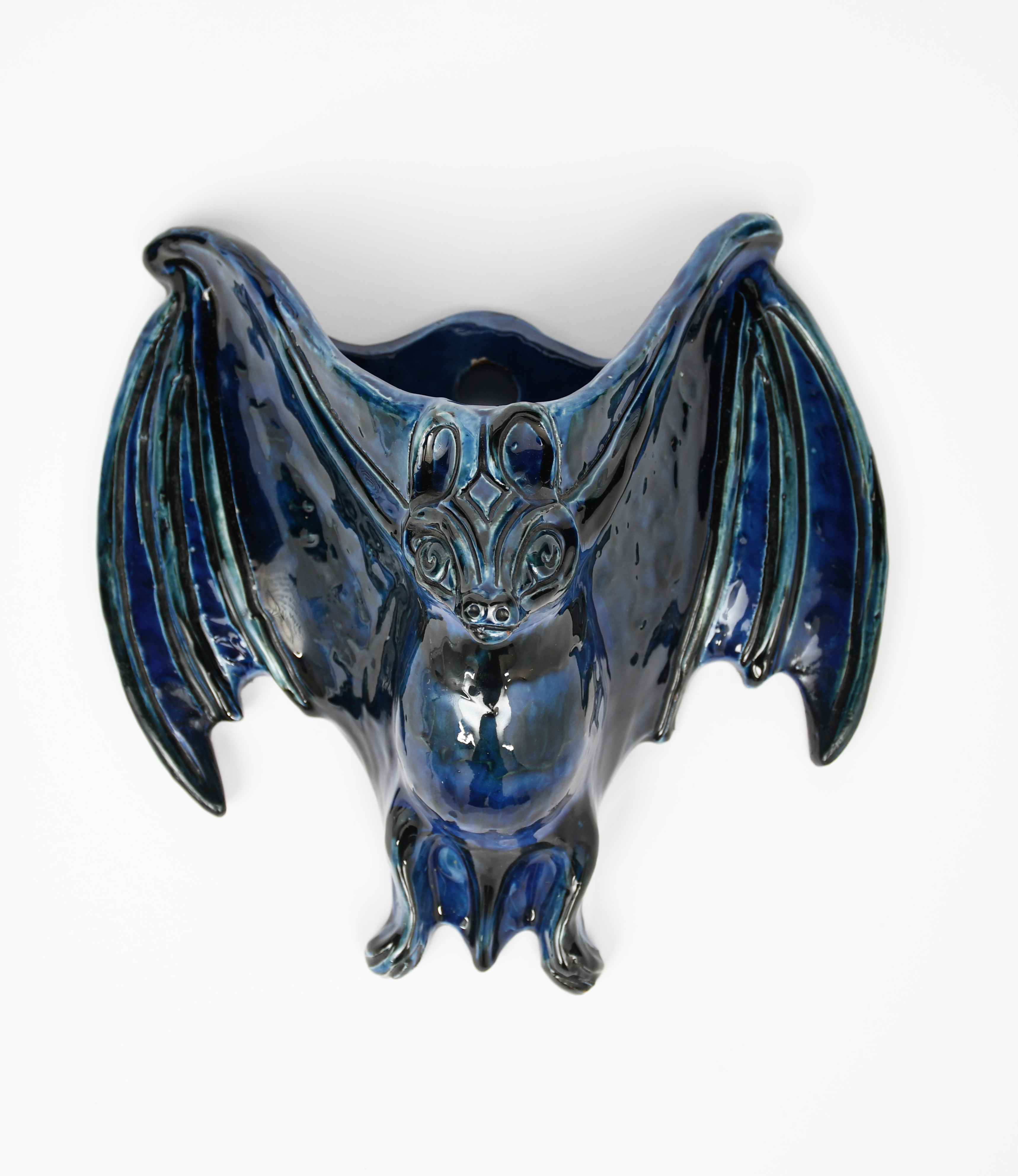 A rare C.H Brannam Barum pottery bat wall pocket, modelled in relief and glazed in shades of blue, incised marks, LC monogram, professional restoration to wings, 20cm. high