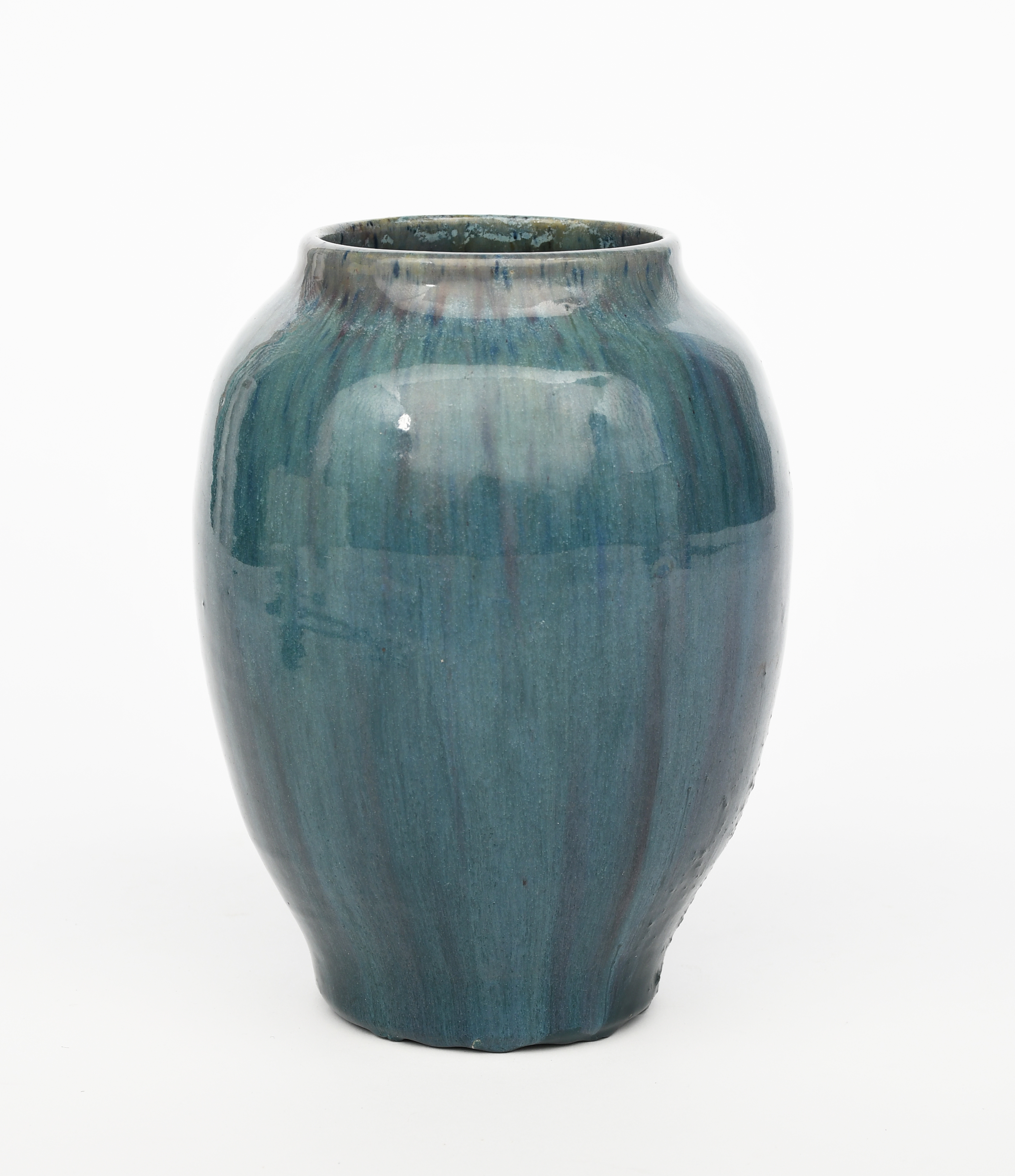 A Coldrum Pottery vase, shouldered ovoid form, covered in a streaked blue glaze over purple, impressed Coldrum, 24cm. high