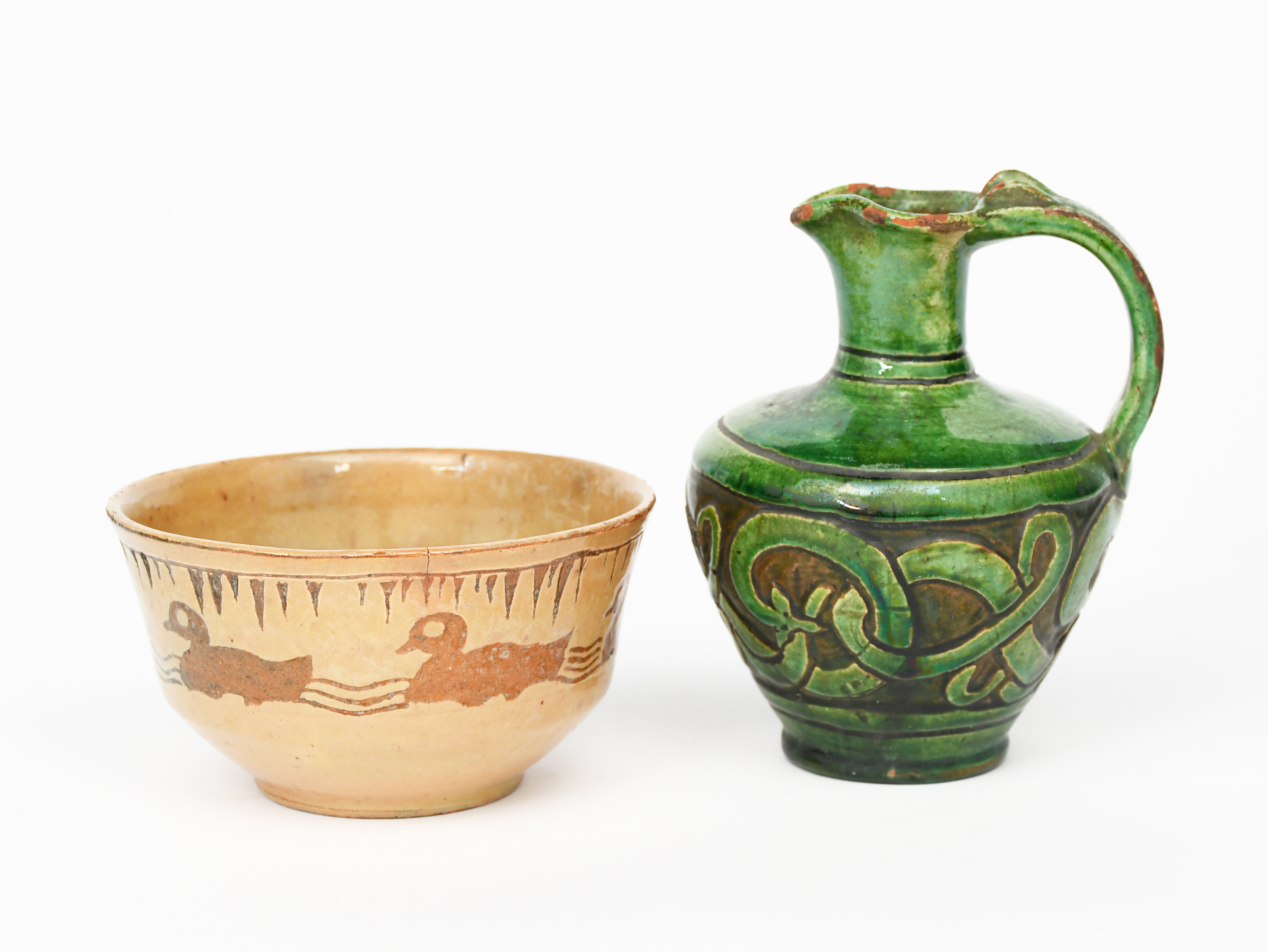 A Farnham Pottery bowl, resist decorated with a frieze of ducks swimming, covered in a sand glaze, and a Farnham Pottery jug decorated in low resist with a band of Celtic knot motif, bowl incised Helena Jagger, Yellow, minor glaze chips, 13cm. diam. (2)