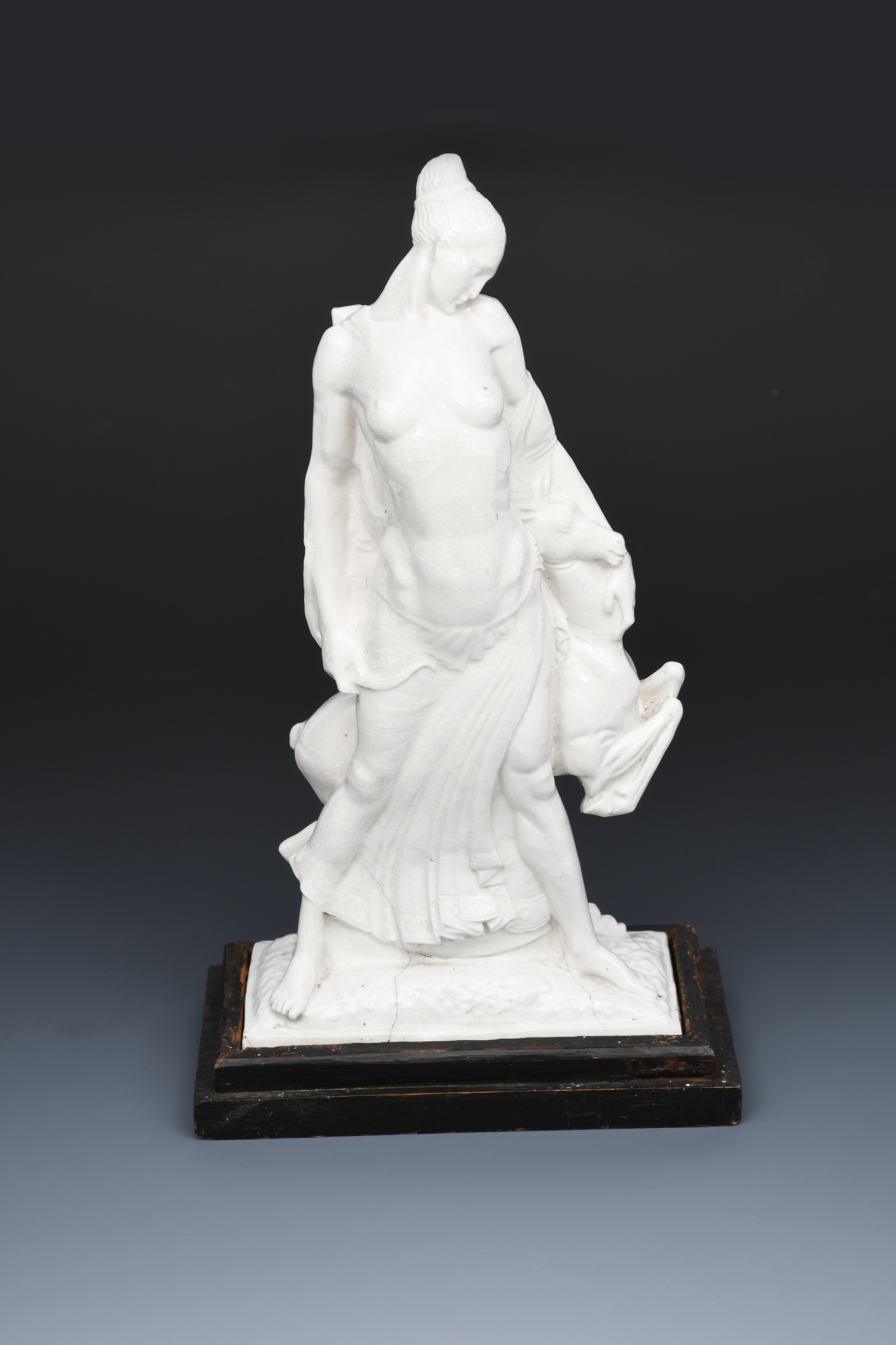 a porcelain figure, covered in a white glaze, with wooden stand impressed Evans David and date, damages, 33cm. high (2)
