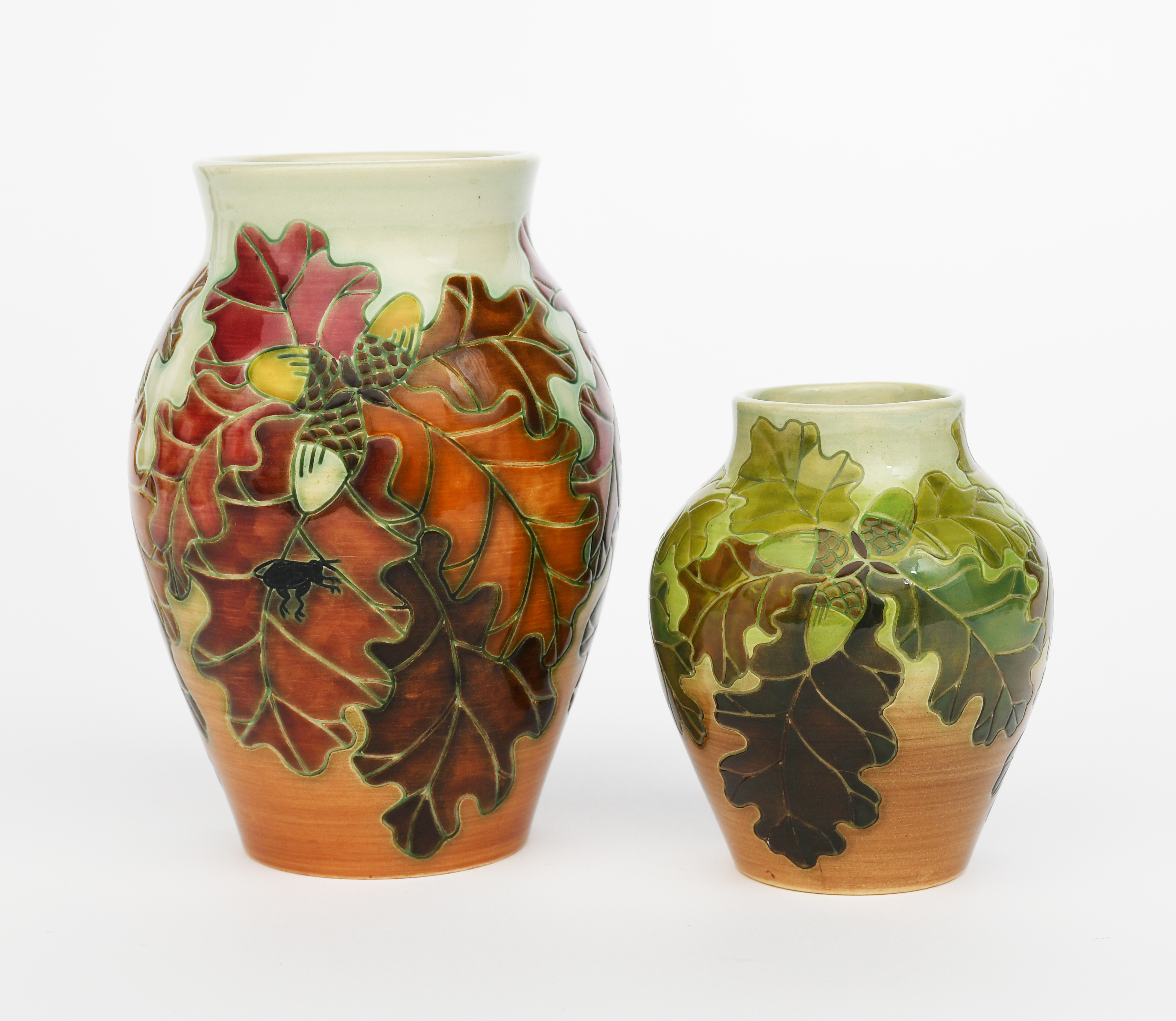 'Oak Leaf and Ladybird' a Dennis Chinaworks vase designed by Sally Tuffin, dated 1997, painted in colours, and an 'Autumn Oak' Dennis Chinaworks vase, impressed and painted marks, 19cm. high (tallest), (2)
