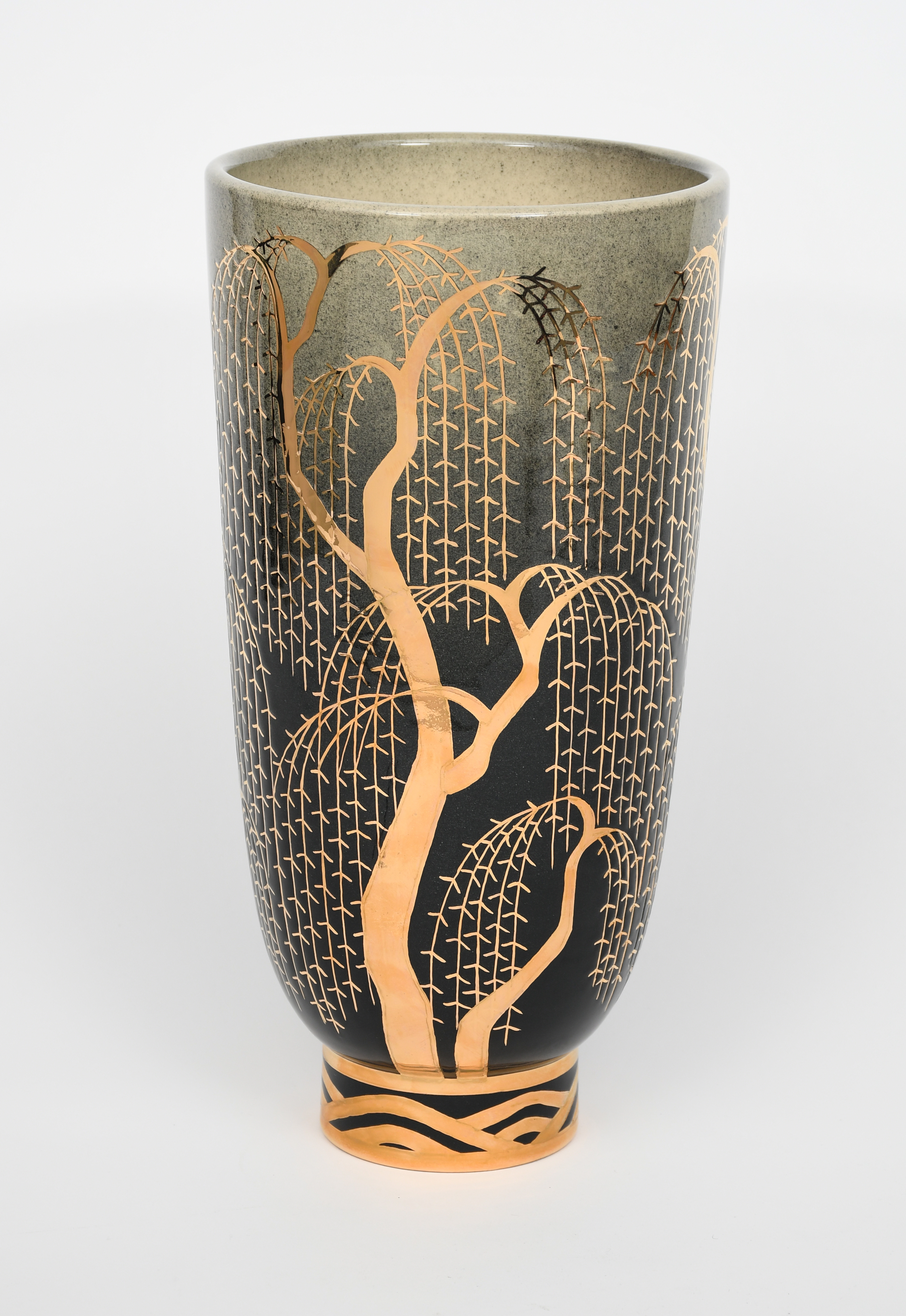 'Black Willow' a unique Dennis Chinaworks Deco shape vase designed by Sally Tuffin, dated 2019, decorated by Theresa Blackmore, thrown by Rory Mcleod, incised with a weeping willow, highlighted in gilt on a sprayed black ground, impressed and painted marks, WW17, 34.5cm. high