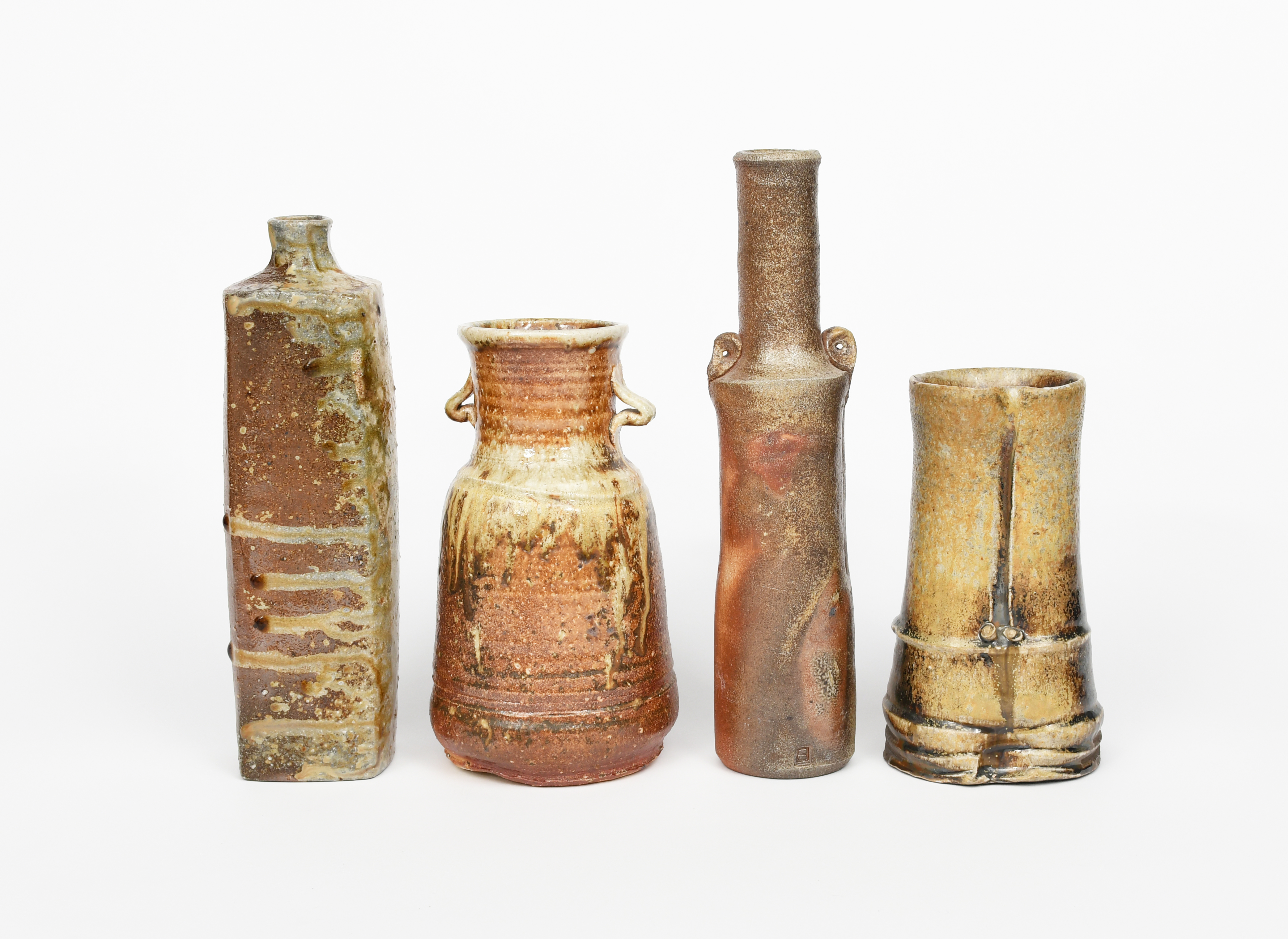 a stoneware vase, shouldered form with applied, twin-loop handles, the textured surface with running ash glaze to neck and shoulder, an Estelle Martin stoneware vase and two other stoneware vases, impressed marks, 25cm. high, (4)