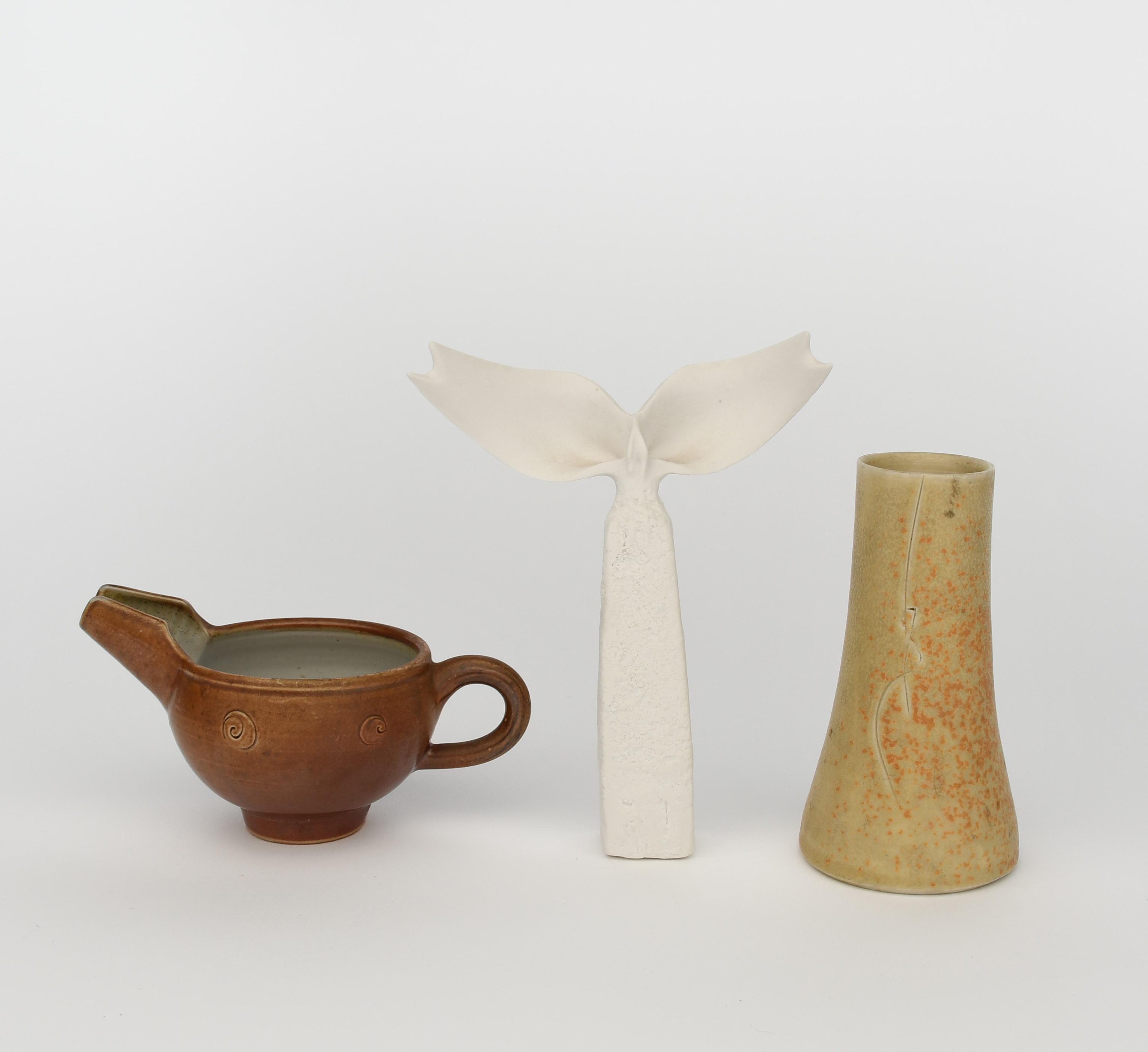 a porcelain cylinder vase, tapering form with incised marks, covered in a cream glaze with rust speckles, a porcelain winged form by Maggie Barnes and a jug by Sheila Casson, impressed seal marks, 14.5cm. high (3)
