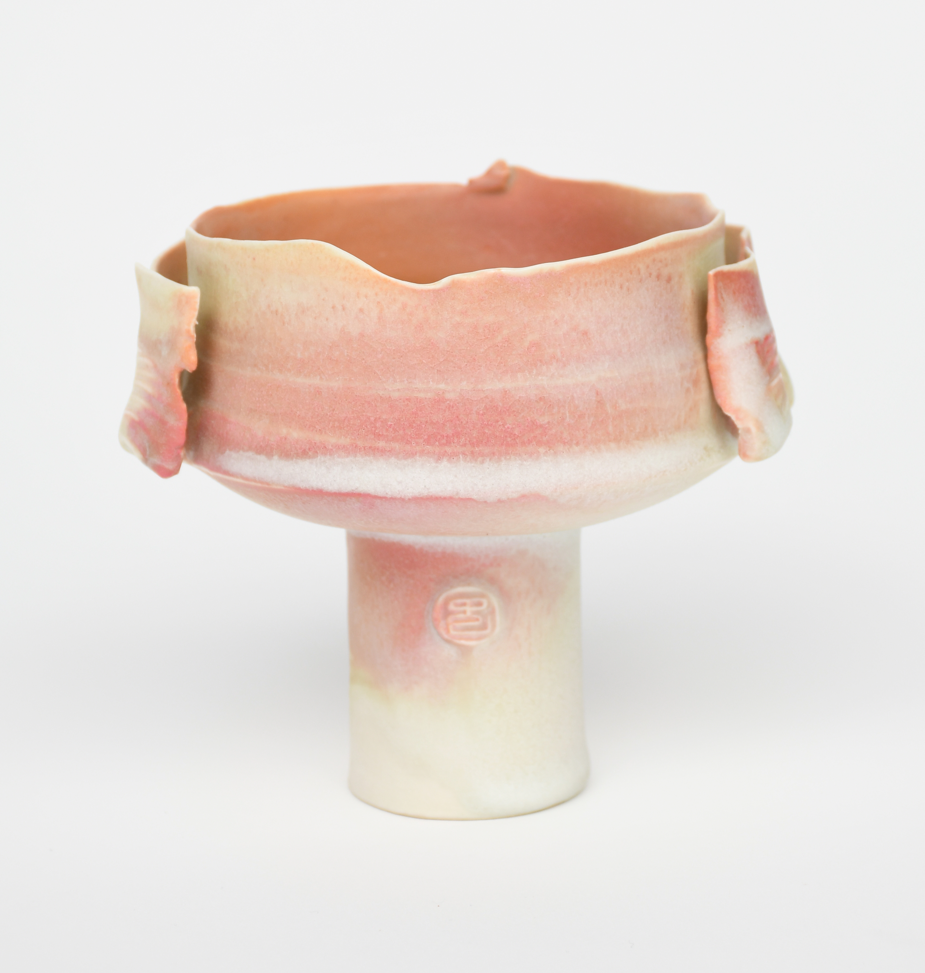 Winged Pot, a porcelain vase form, glazed pale salmon and sand on a white ground impressed seal mark, 10.5cm. high