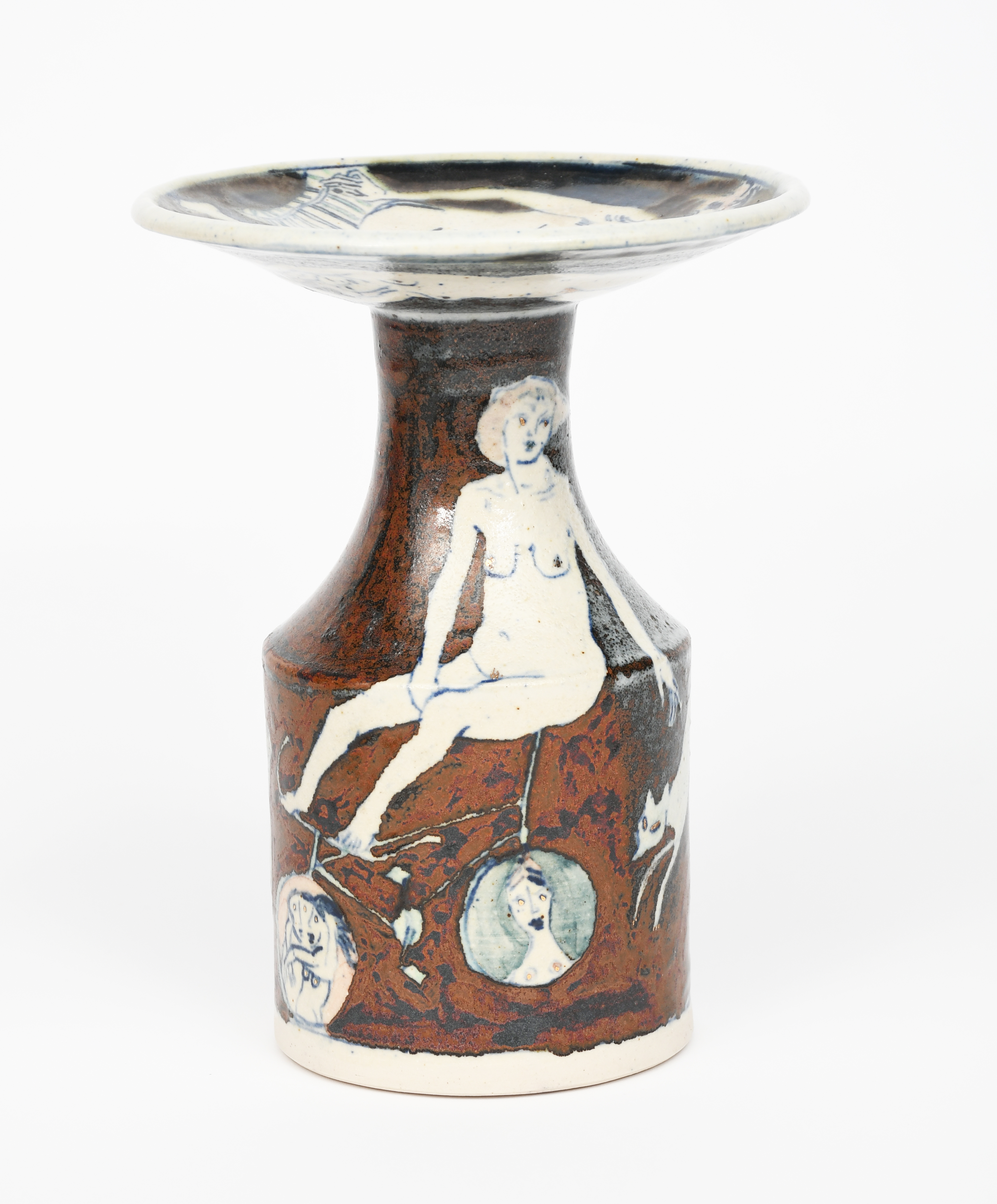 Theme of Tenderness with a Bicycle, a stoneware vase dated 2000, cylindrical with tapering neck and broad flaring rim, painted with naked lady riding a bicycle, and erotic figures resting, ash glazed in colours highlighted in gilt, the base with a woman playing a flute, signed, titled and dated to base rim, 20cm. high