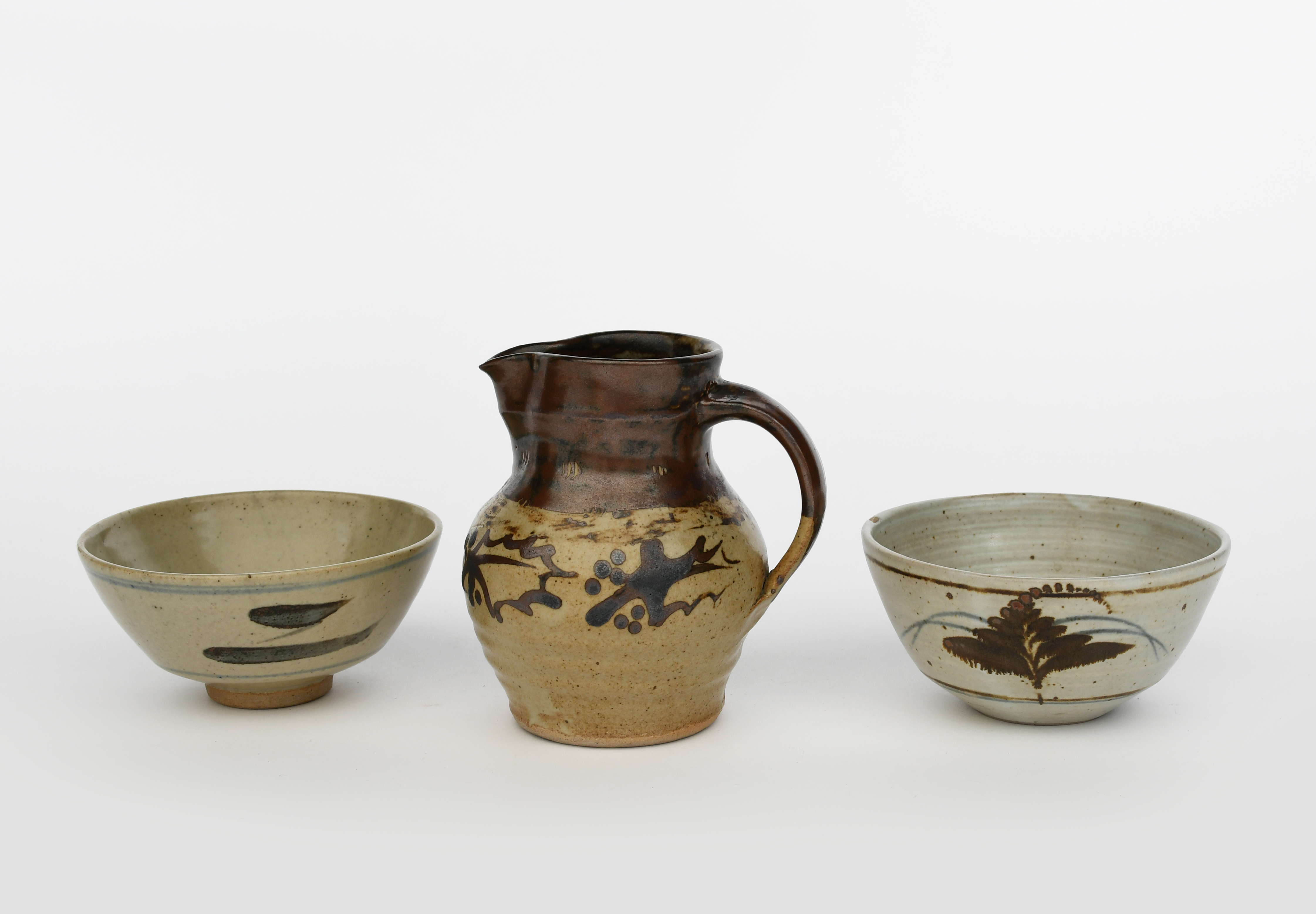 a stoneware jug, painted with a band of holly in iron on a buff ground, a Leach Pottery stoneware bowl and a Lowerdown Pottery bowl, impressed seal marks, 15cm. high, (3)