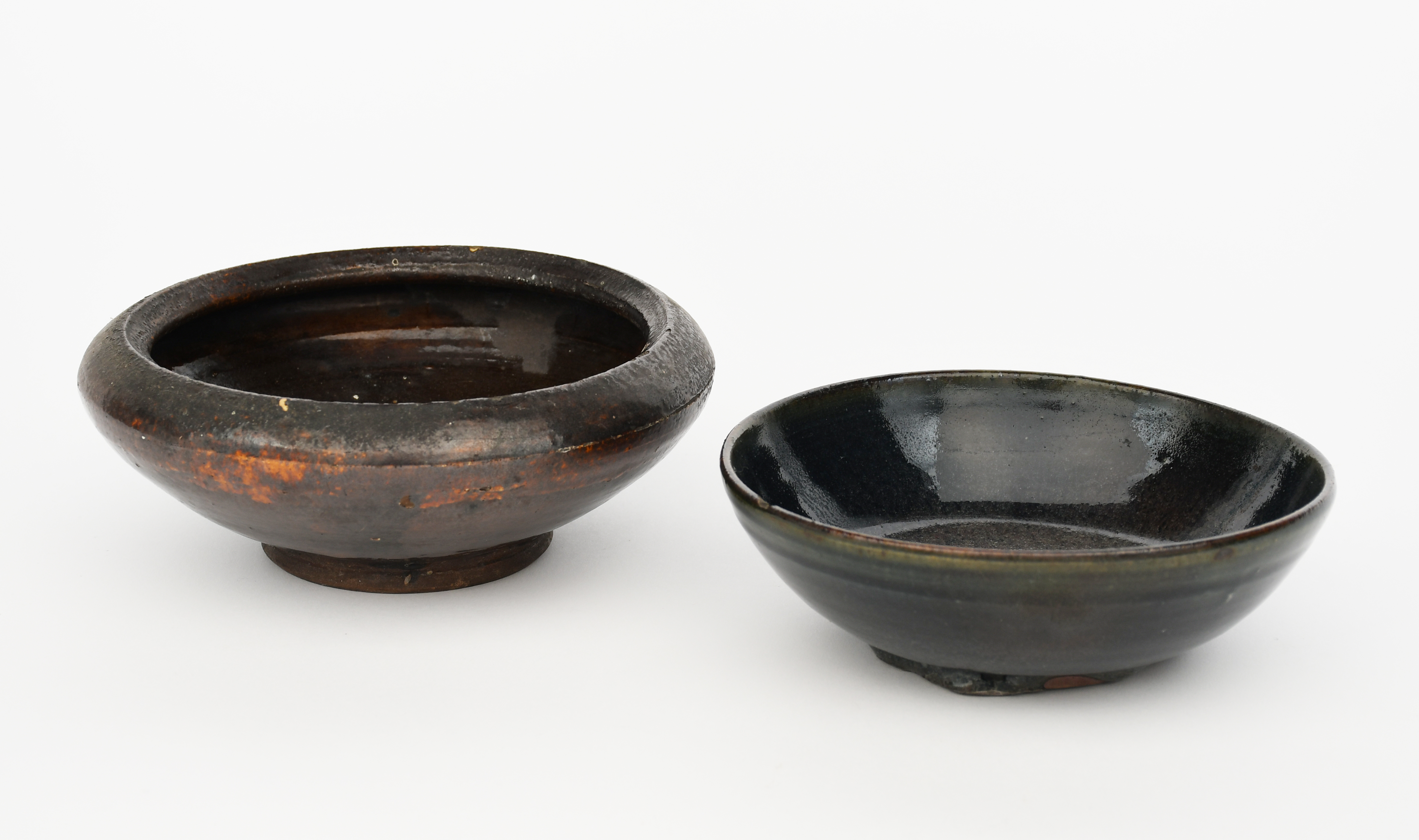 a Leach pottery stoneware bowl, footed form, covered in a running hare's fur glaze, and another Leach Pottery earthenware bowl impressed seal marks, chip to top rim, 17cm. diam. (2)