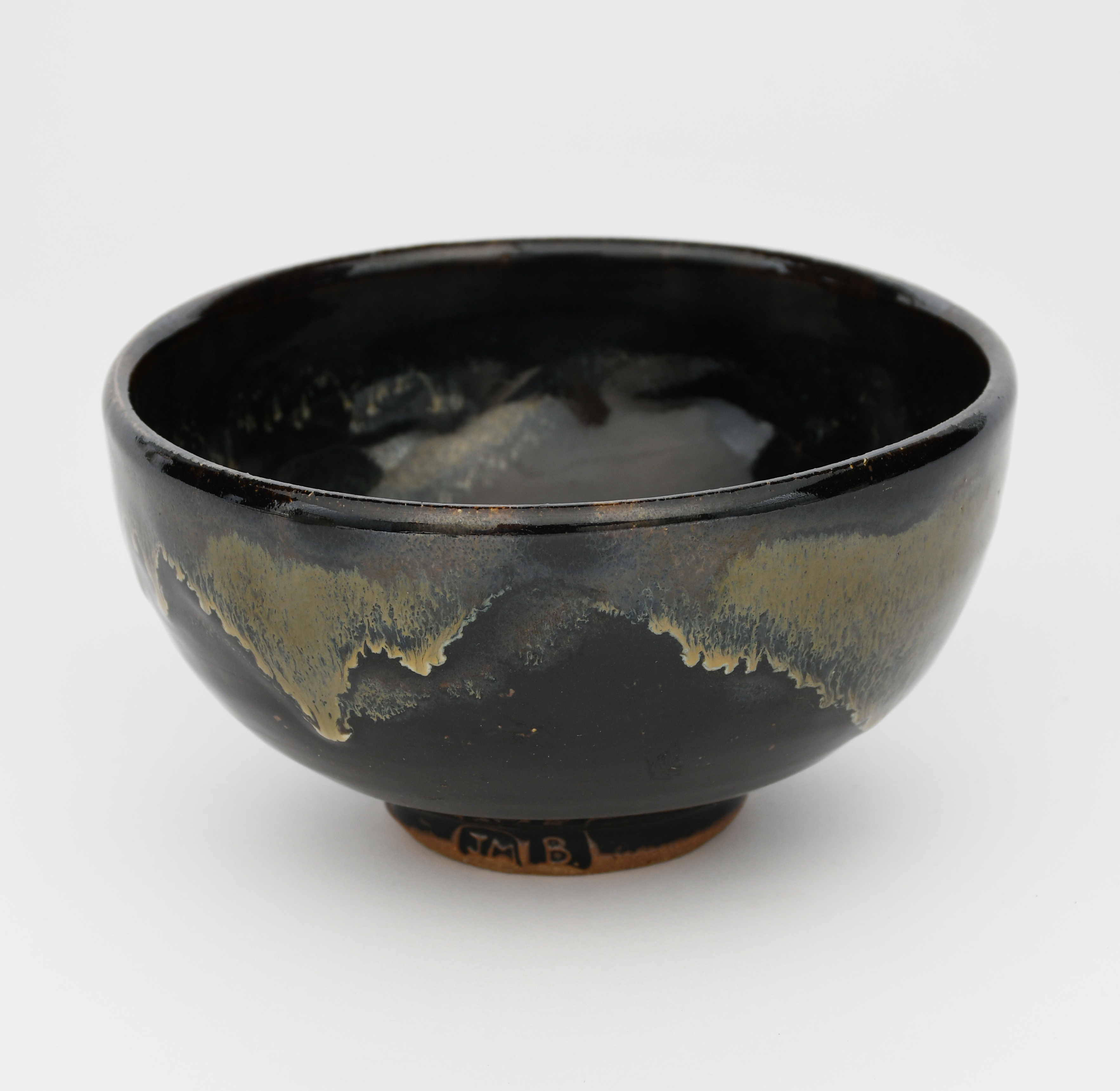 a stoneware, footed bowl, covered to the foot with a tenmoku glaze and copper pours, impressed marks, 17cm. diam.