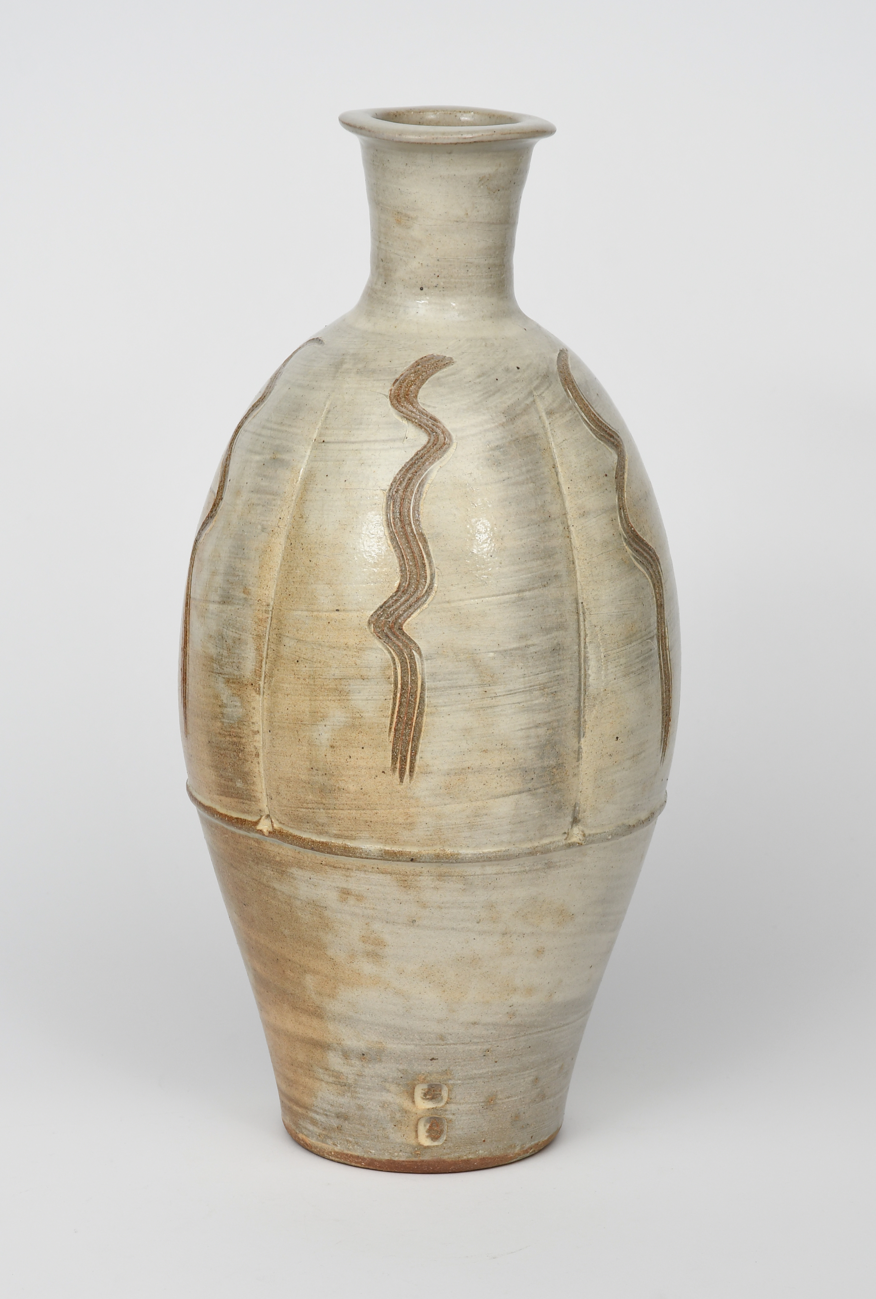 an Ainstable Pottery stoneware vase, bottle form with cylindrical neck and flaring rim, incised with simple comb columns and indents, covered to the foot in a translucent glaze impressed seal marks, 40cm. high