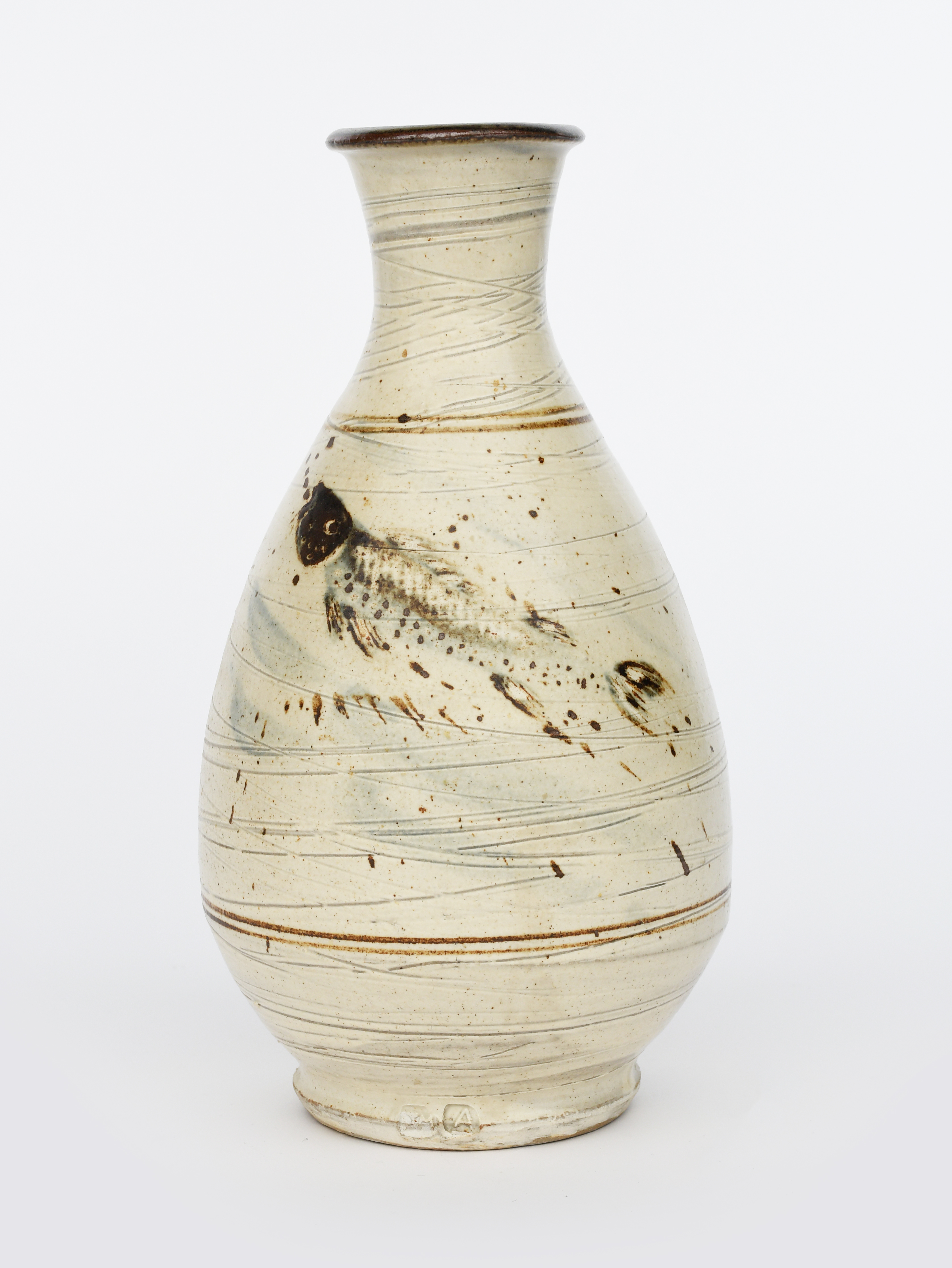 an Ainstable Pottery Korean bottle vase, covered to the foot in a hakeme glaze, with painted fish coming to the surface, impressed seal marks, 30cm. high