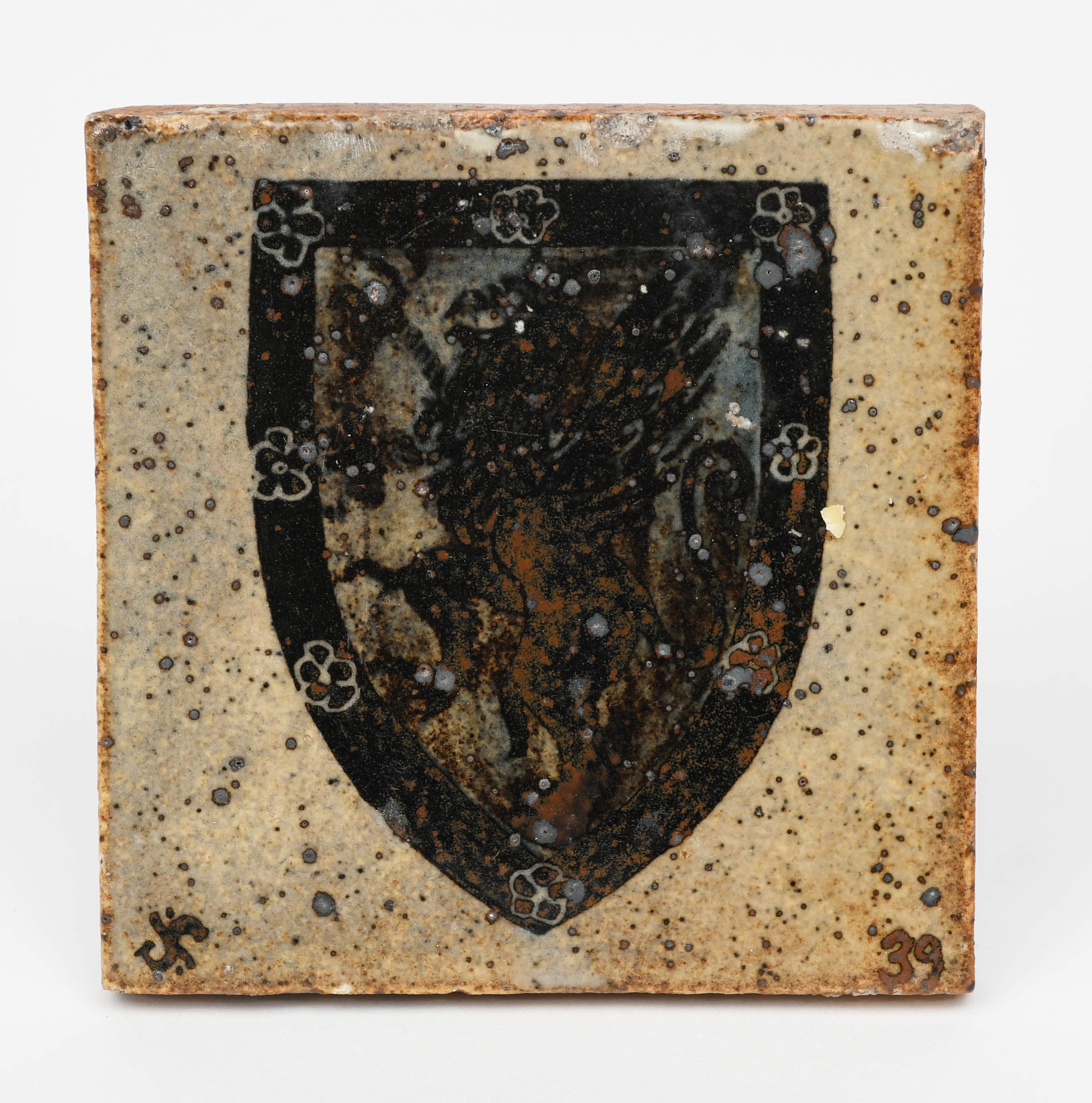 a Leach Pottery tile dated 1939, painted with a heraldic shield of a griffin rampant, in tenmoku on an oatmeal ground, painted Leach Pottery and 39 date, impressed Leach Pottery seal marks to reverse, 10cm. square