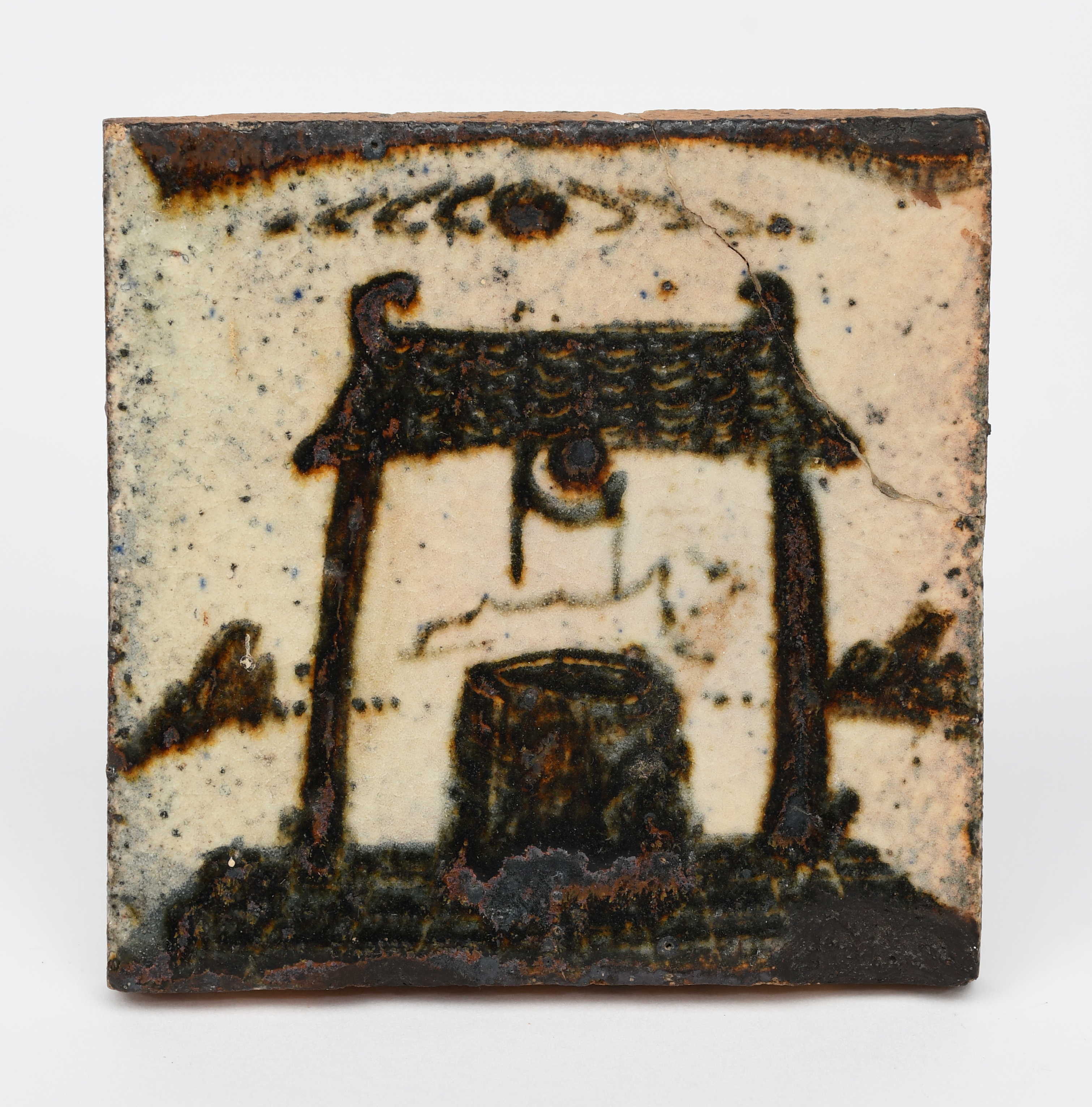 a Leach Pottery tile, painted with a Japanese well, in tenmoku on an oatmeal ground, impressed Leach Pottery seal marks to reverse, repaired corner, chip to base rim, 10cm. square
