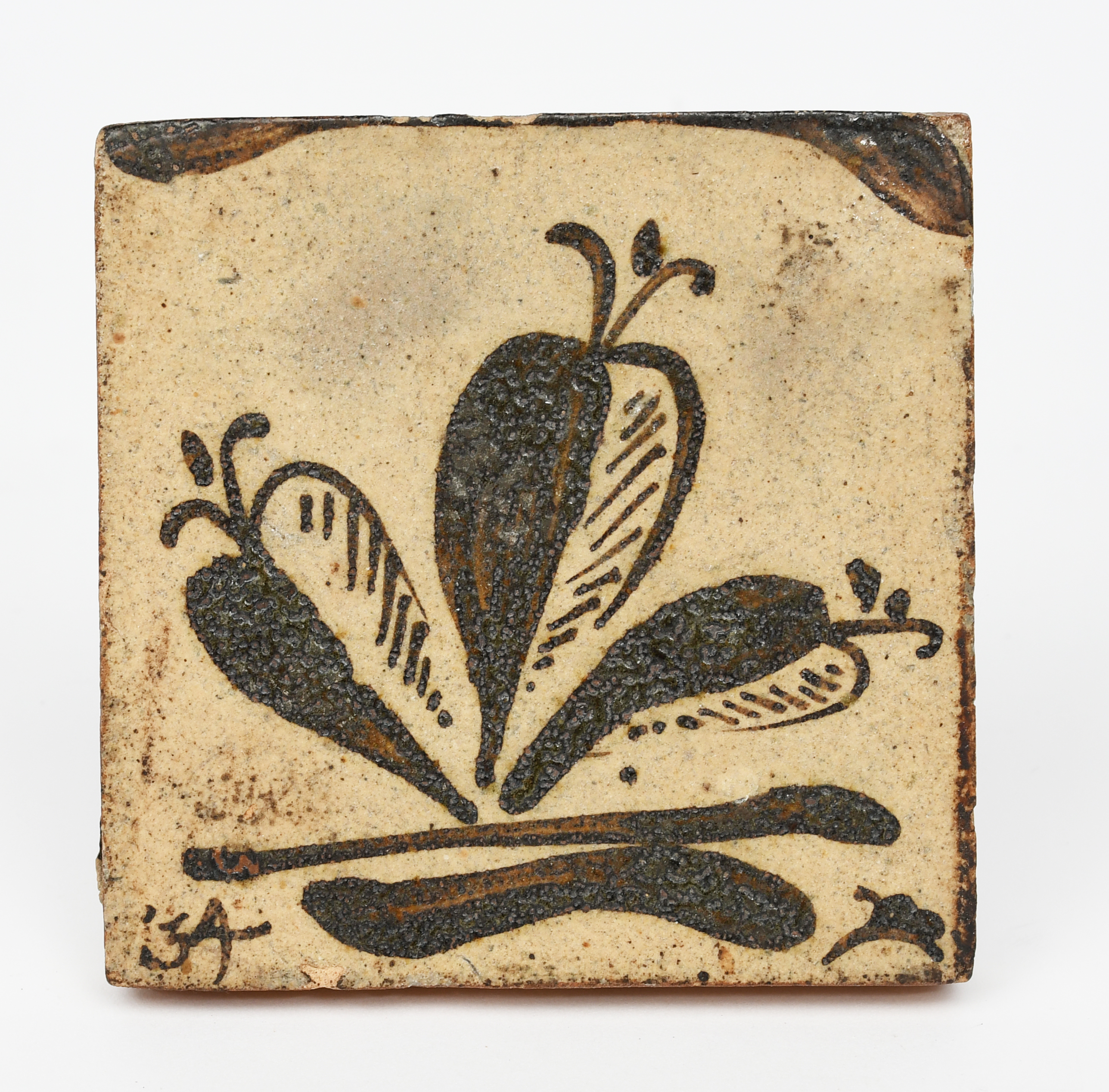 a stoneware tile dated 1934, painted with an exotic flower in tenmoku on an oatmeal ground, painted 34 date and BL monogram, impressed M Pottery seal marks to reverse, 10.5cm. square