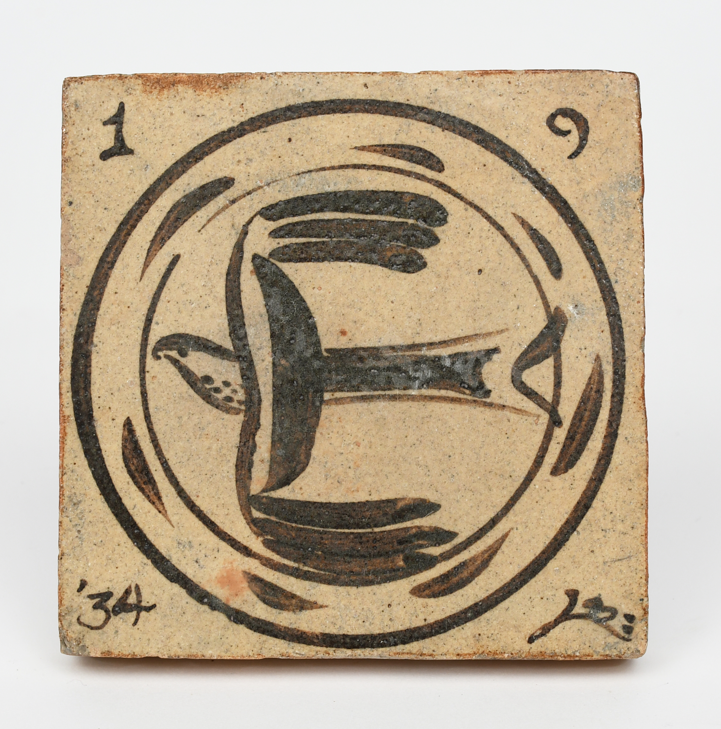 a tile dated 1934, painted with a stylised flying hawk, in circular border the corners dated 1934, in tenmoku on an oatmeal ground, painted BL monogram, 1934 date and impressed M pottery seal marks to reverse, 10.5cm. square