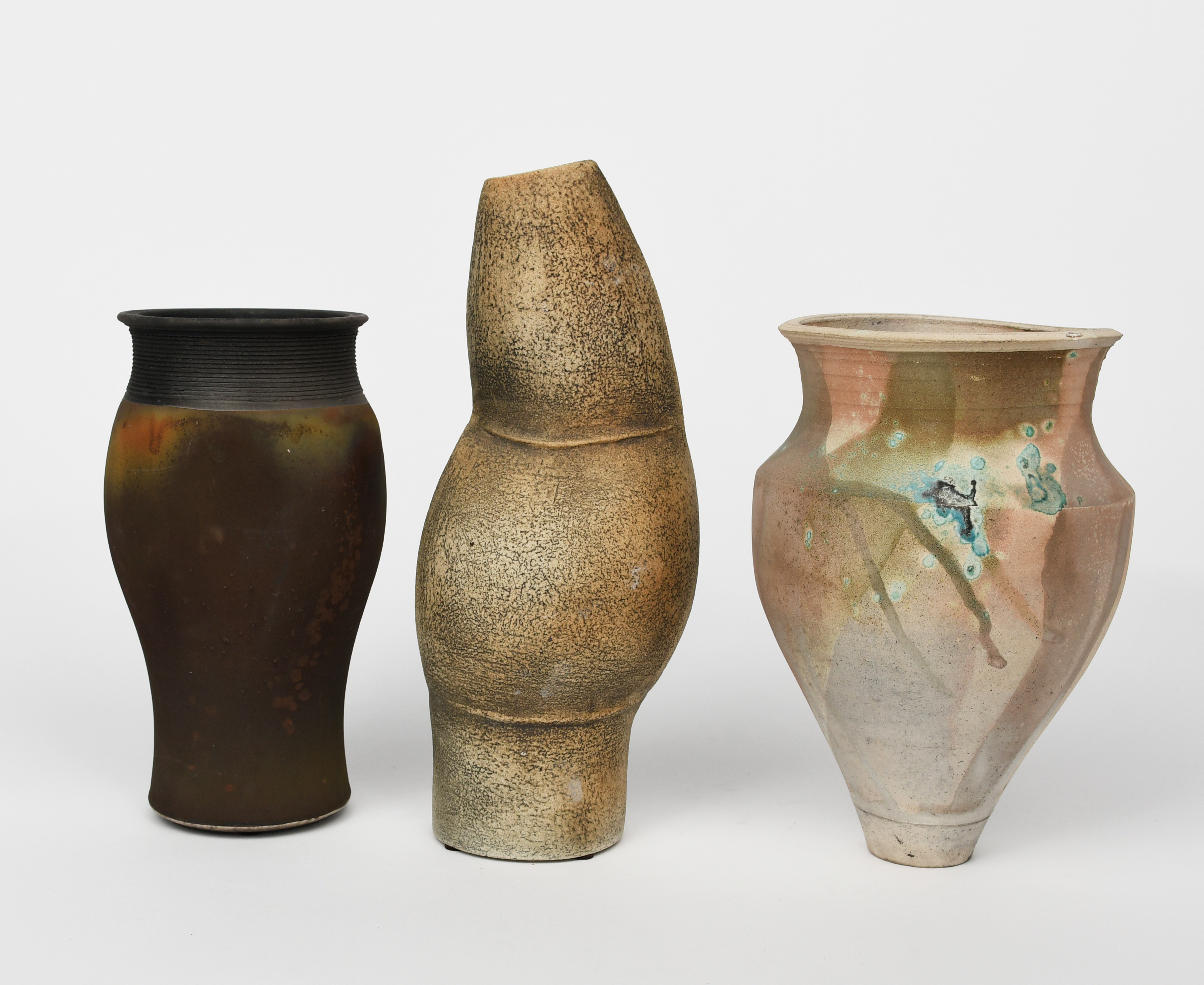 an earthenware vase, dated 1991, swollen elliptical form with textured surface glazed mushroom on buff, a burnished raku vase by John Wheeldon, another vase, three large stoneware chargers and four other pots