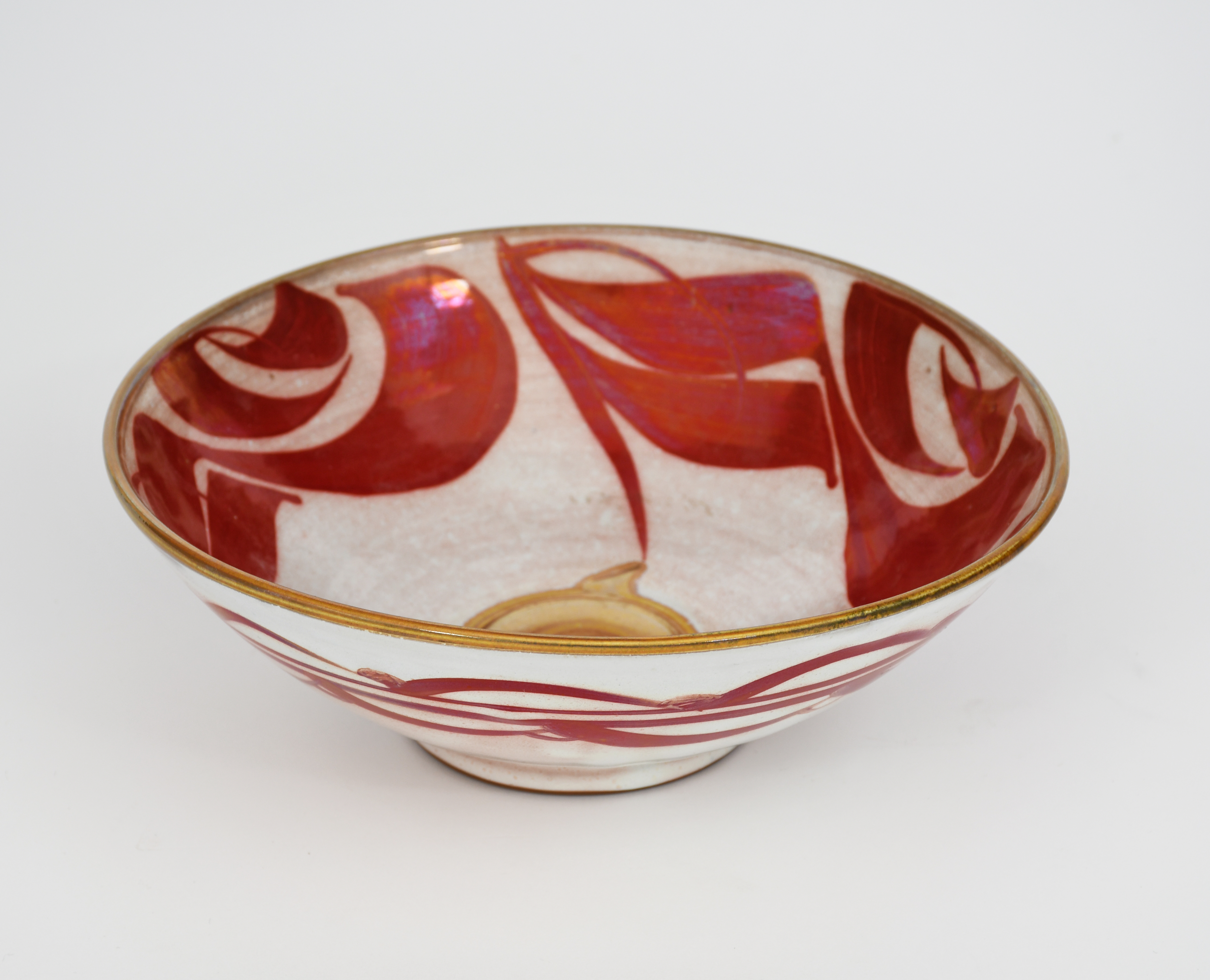 an Aldermaston Pottery footed bowl, flaring form painted with red lustre brush motif, highlighted in sand lustre on an off-white tin glaze painted monogram, AW mark and date code for