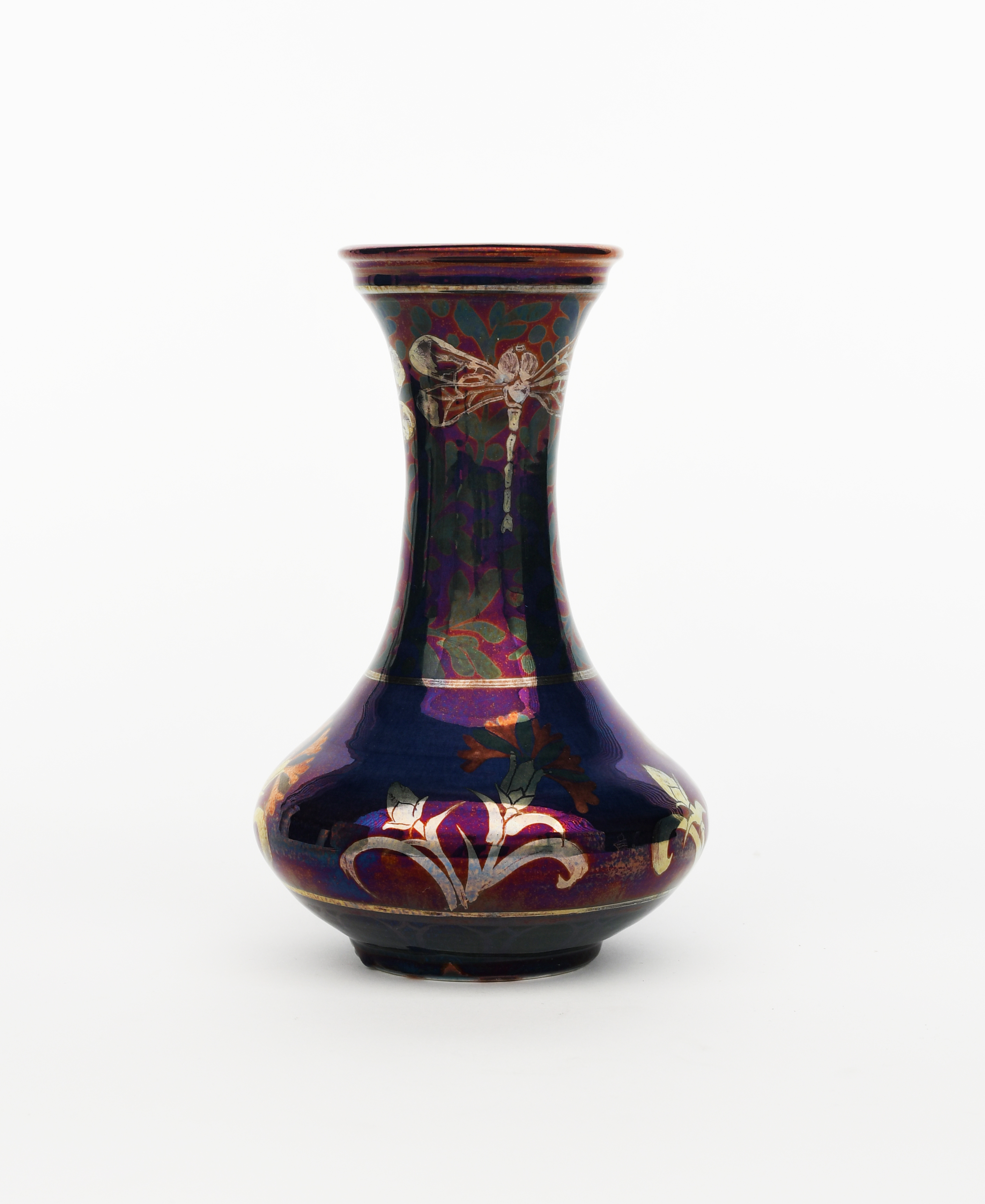 an earthenware bottle vase, dated 2008, painted with carnation flowers in ruby and gold lustre on a midnight blue ground, painted marks, 25.5cm. high
