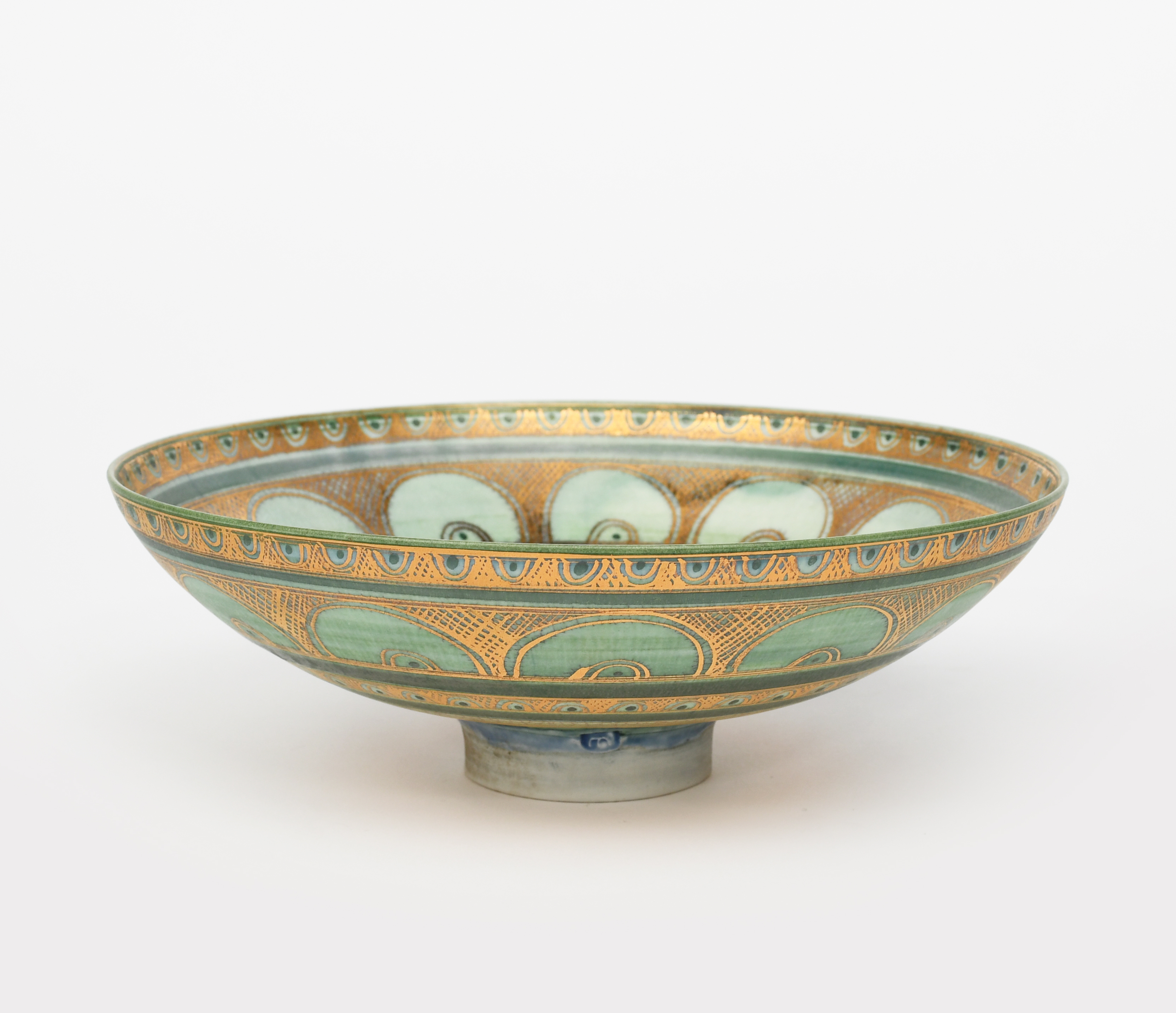 a large porcelain flaring footed bowl, decorated with gilt geometric bands over turquoise impressed seal mark, 24.5cm. diam.