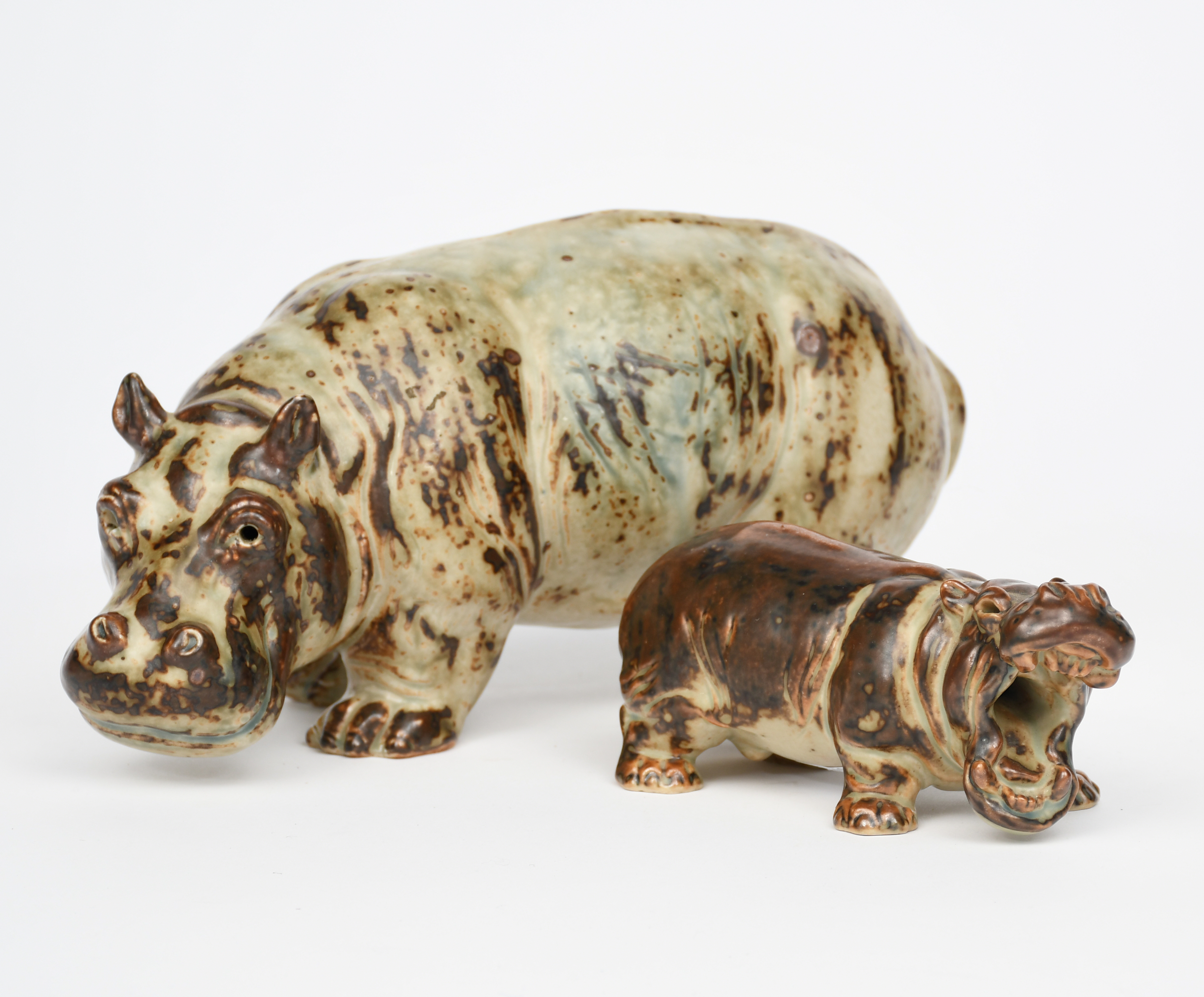 A Royal Copenhagen model of a Hippopotamus designed by Knud Kyhn, model no.20132, modelled standing, with mottled glaze, and another Royal Copenhagen hippopotamus, model no.20234, modelled yawing printed and painted marks, incised monogram, 28cm. wide (2)