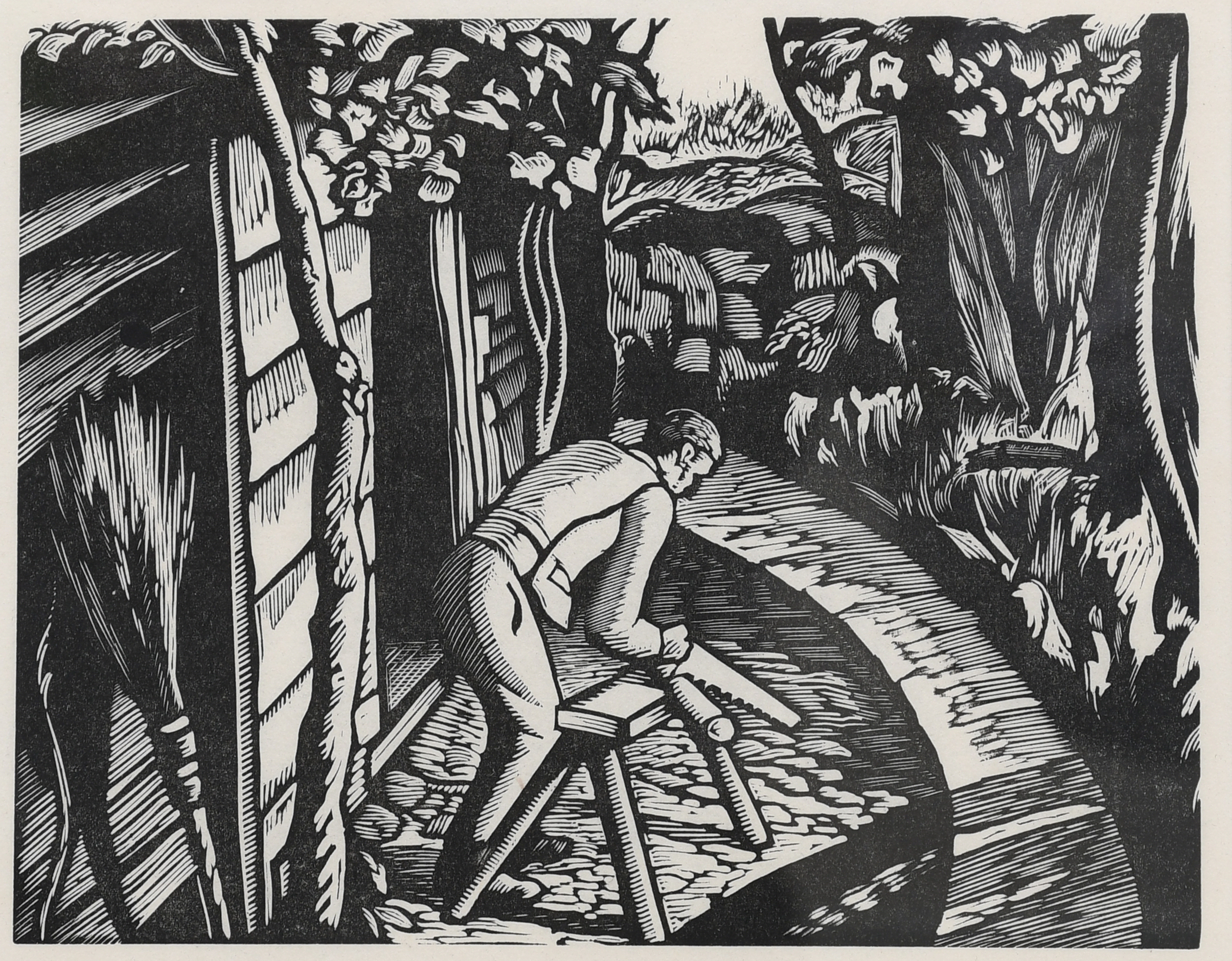 a wood engraving on paper, framed and five other wood engravings comprising, The Haystacks 4, The Cowman, Story of My Heart and two untitled,