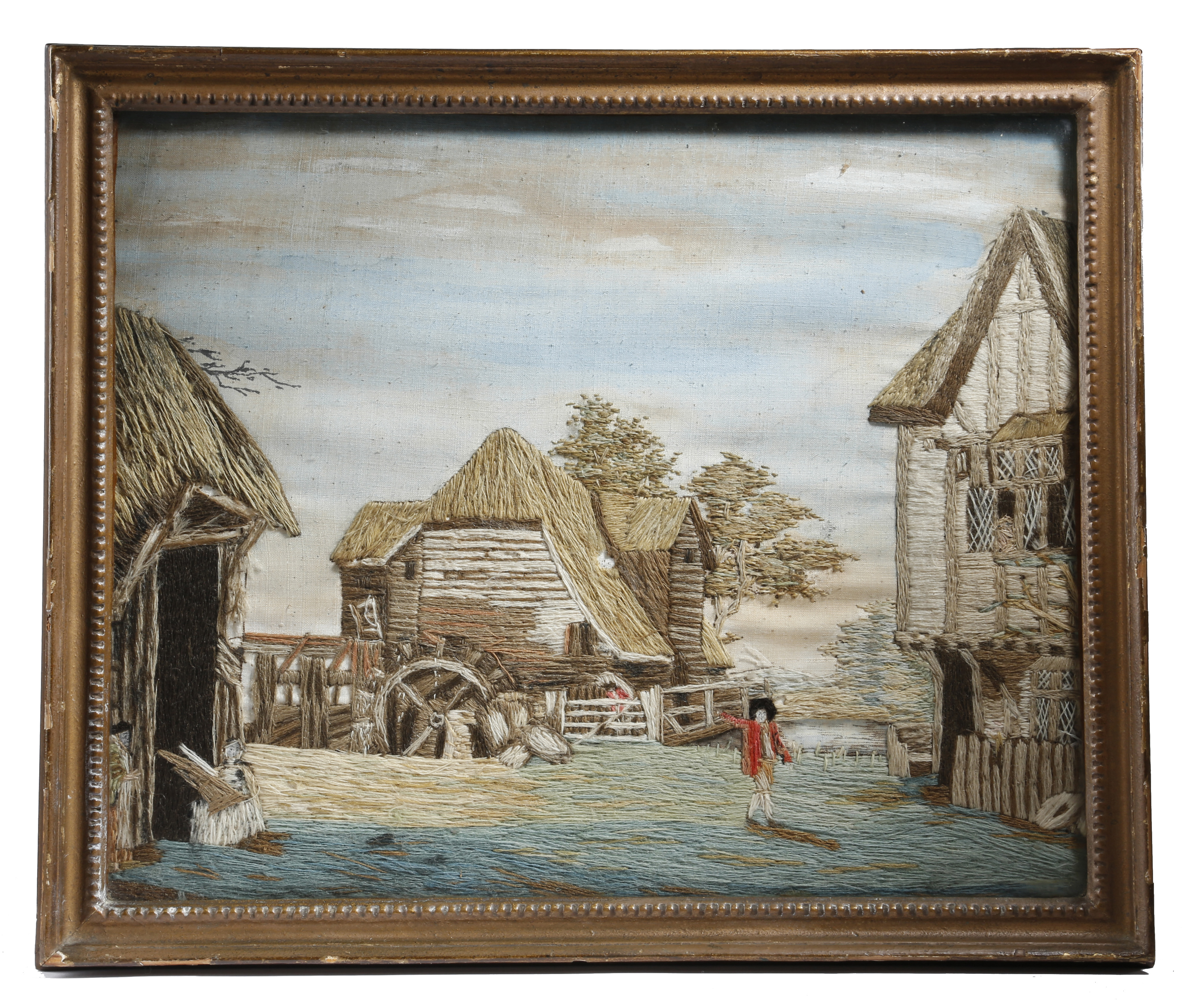 A George III folk art woolwork and watercolour picture, depicting a farmyard scene, with a watermill and attendant figures, 31.2 x 38.5cm, in a glazed giltwood frame.