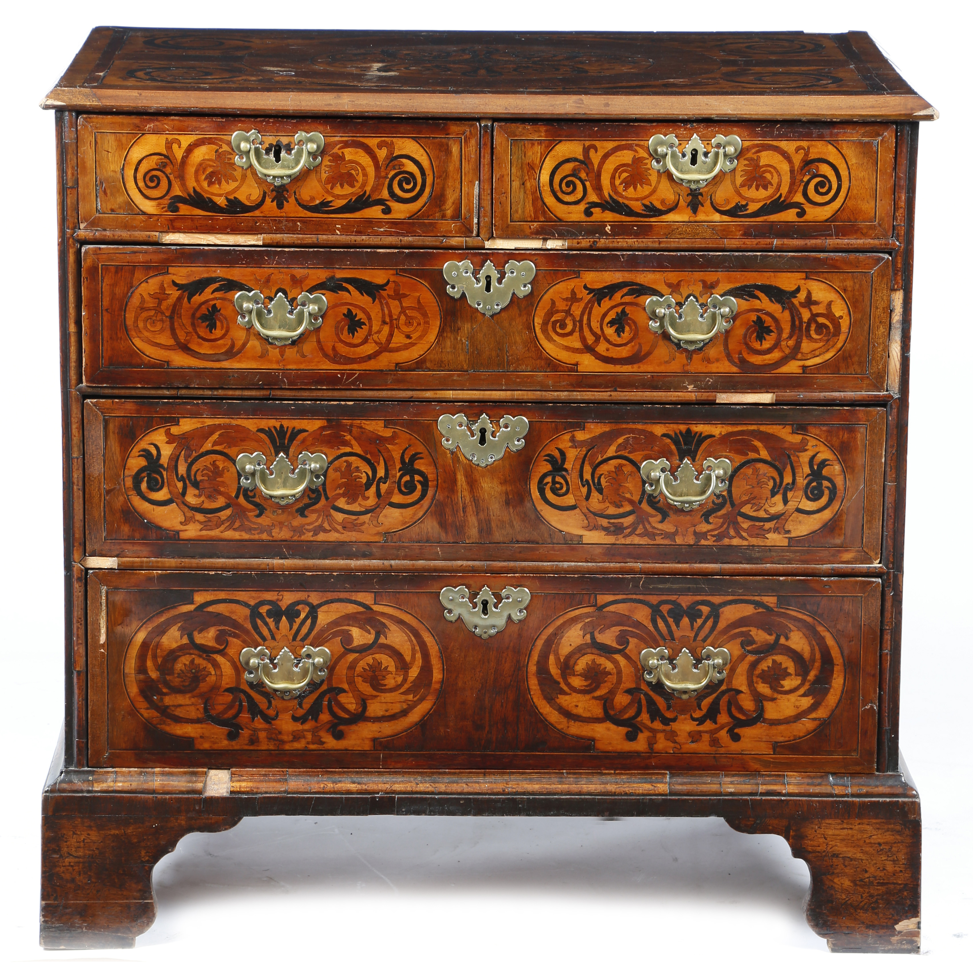 An Anglo-Dutch walnut and fruitwood marquetry chest, inlaid with panels of scrolling leaves and flowers, with two short and three long graduated drawers, on later bracket feet, late 17th / early 18th century, 95.2cm high, 95.8cm wide, 59.8cm deep.