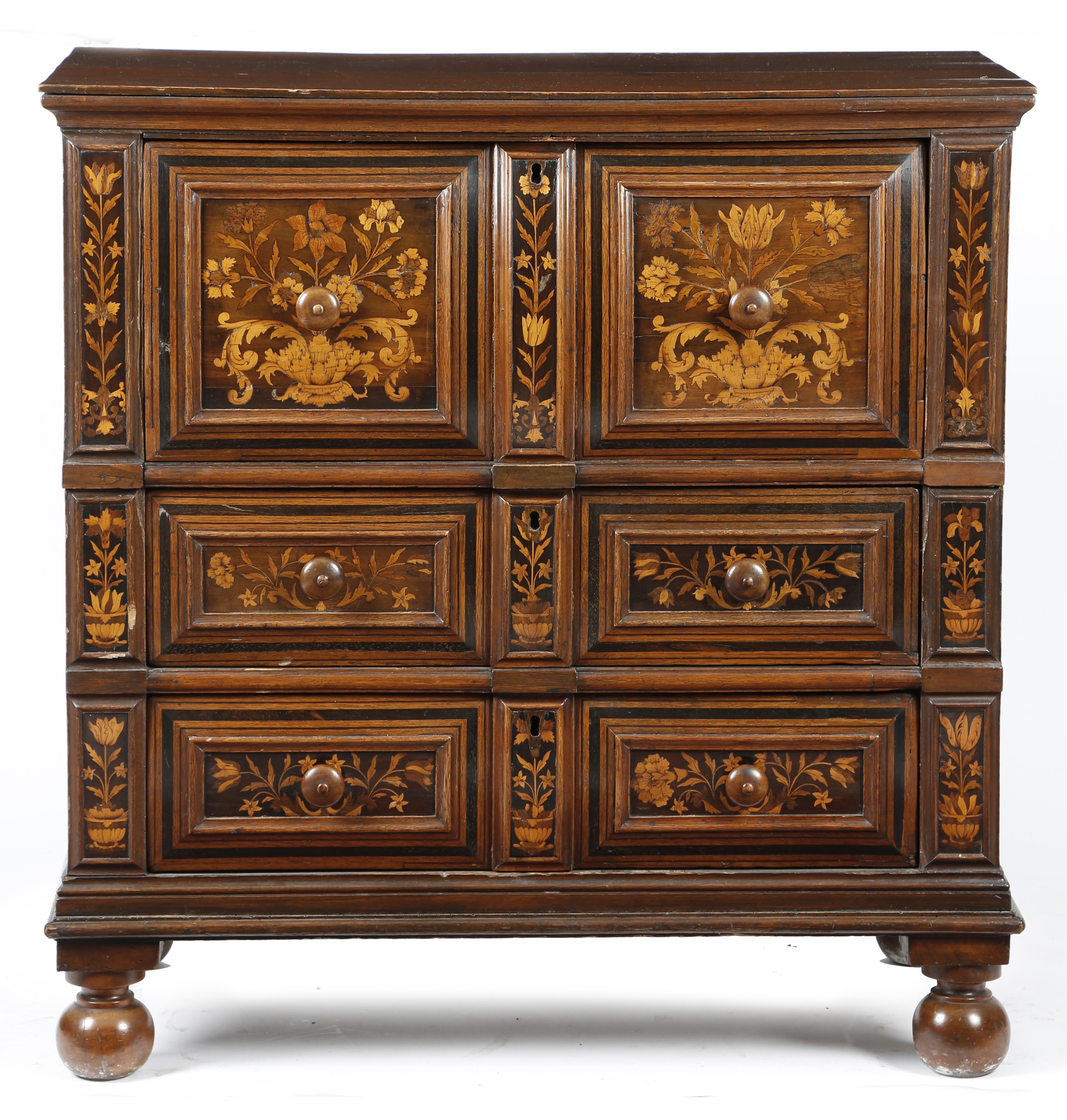 A William and Mary Anglo-Dutch oak and marquetry chest, in two halves, with ebonised banding and inlaid with fruitwoods with urns of flowers, with a deep top drawer with a paper label inscribed in pen 'This chest of drawers was given to C. G. Orde in 1860. I leave it to Evelyn Alice Orde.', above two further long drawers, on later bun feet, 98.1cm high, 95.4cm wide, 53.7cm deep.