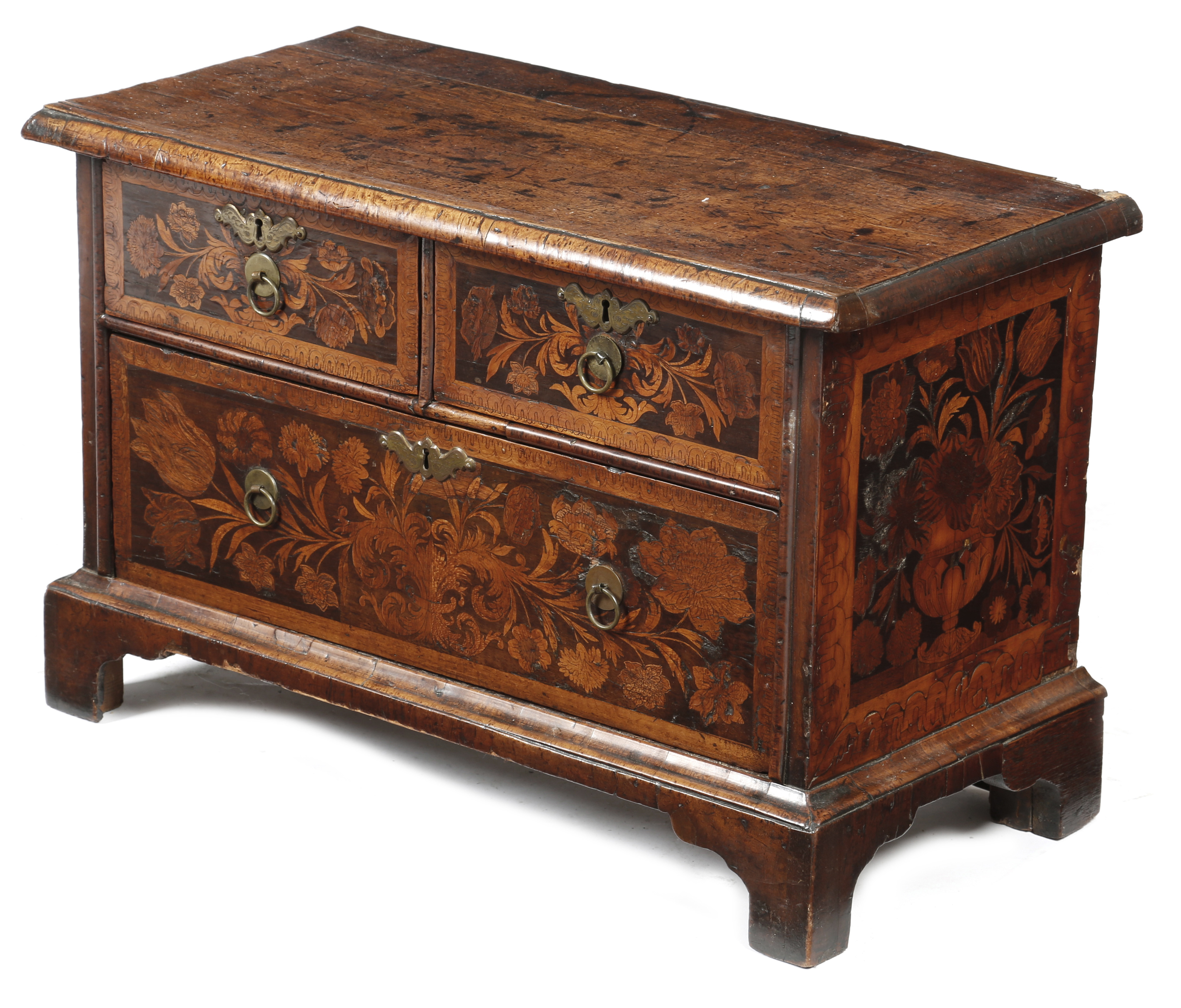 A small Anglo-Dutch walnut and fruitwood marquetry chest, inlaid with ribbon tied flowers and the sides with urns of flowers, with two short and one long drawer, on bracket feet, late 17th / early 18th century, 39cm high, 60.2cm wide, 28.7cm deep.