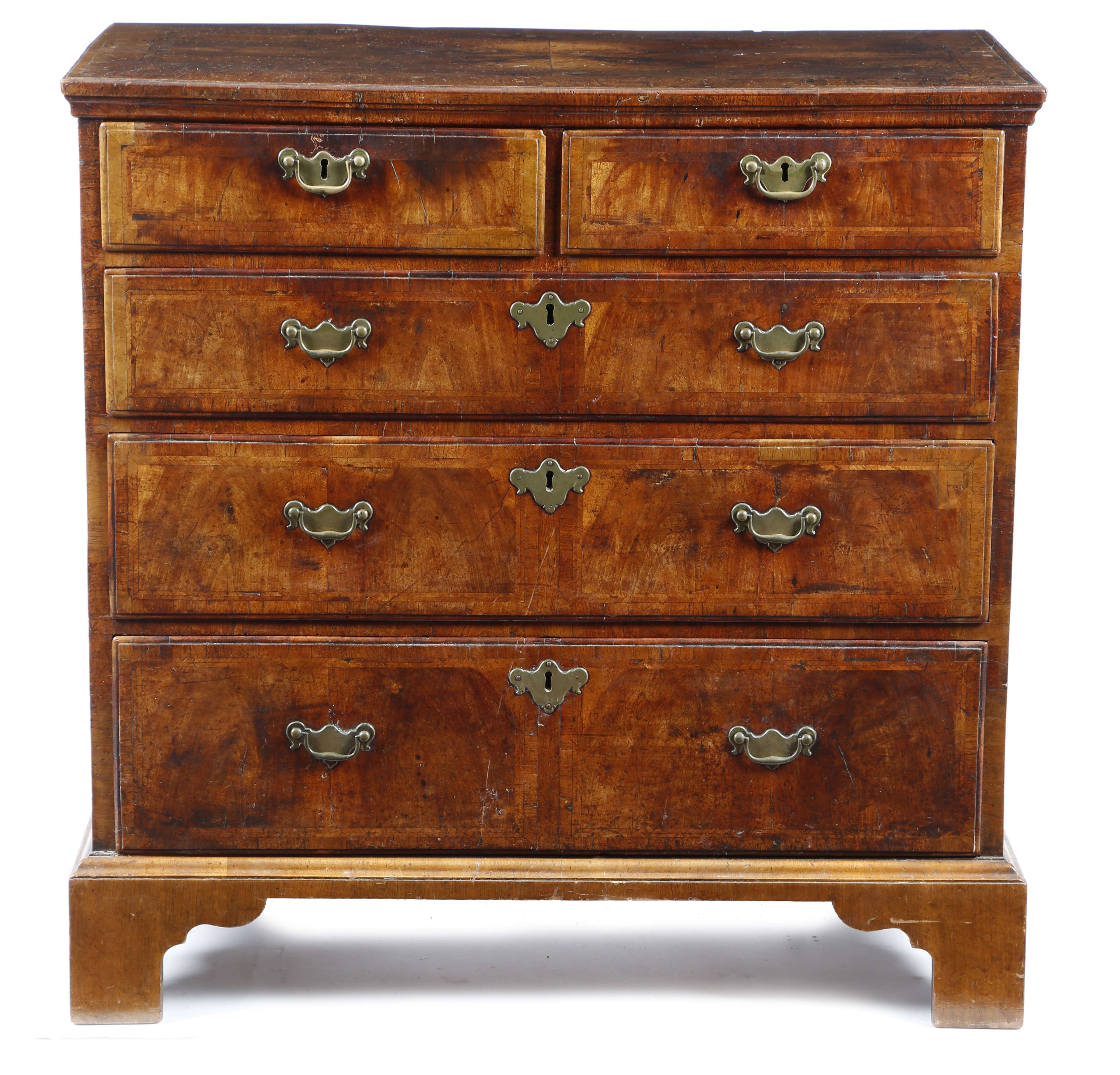 A George II walnut chest, the quarter veneered top with cross and feather banding, above two short and three long conforming drawers, on bracket feet, 92cm high, 92.8cm wide, 52.2cm deep.