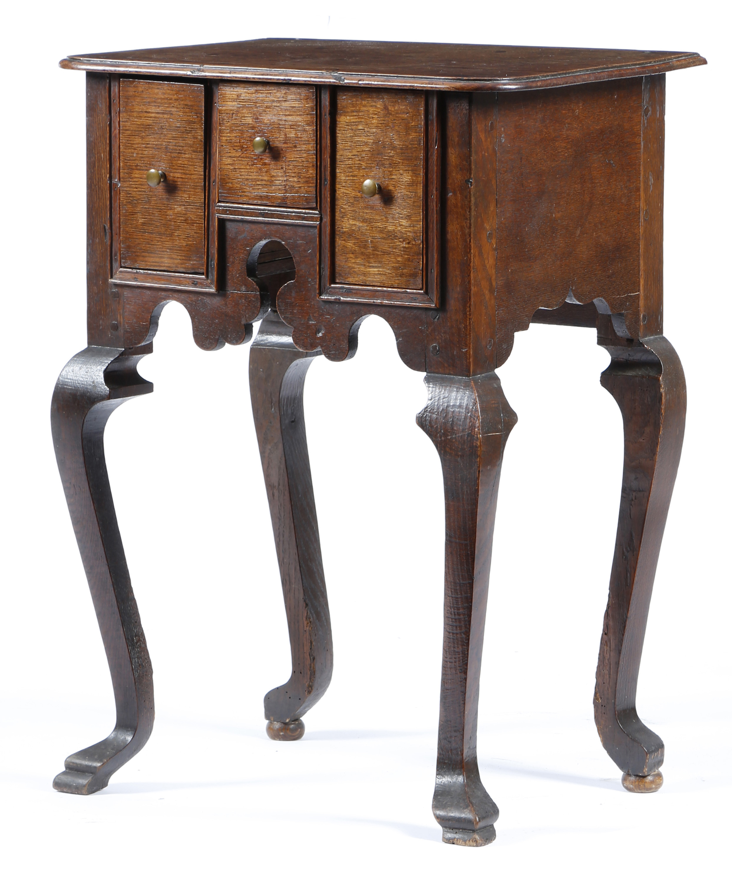 A small George II oak lowboy, the top with a moulded edge, above three frieze drawers and a shaped apron, on faceted cabriole legs, 70.9cm high, 51cm wide, 38.6cm deep.