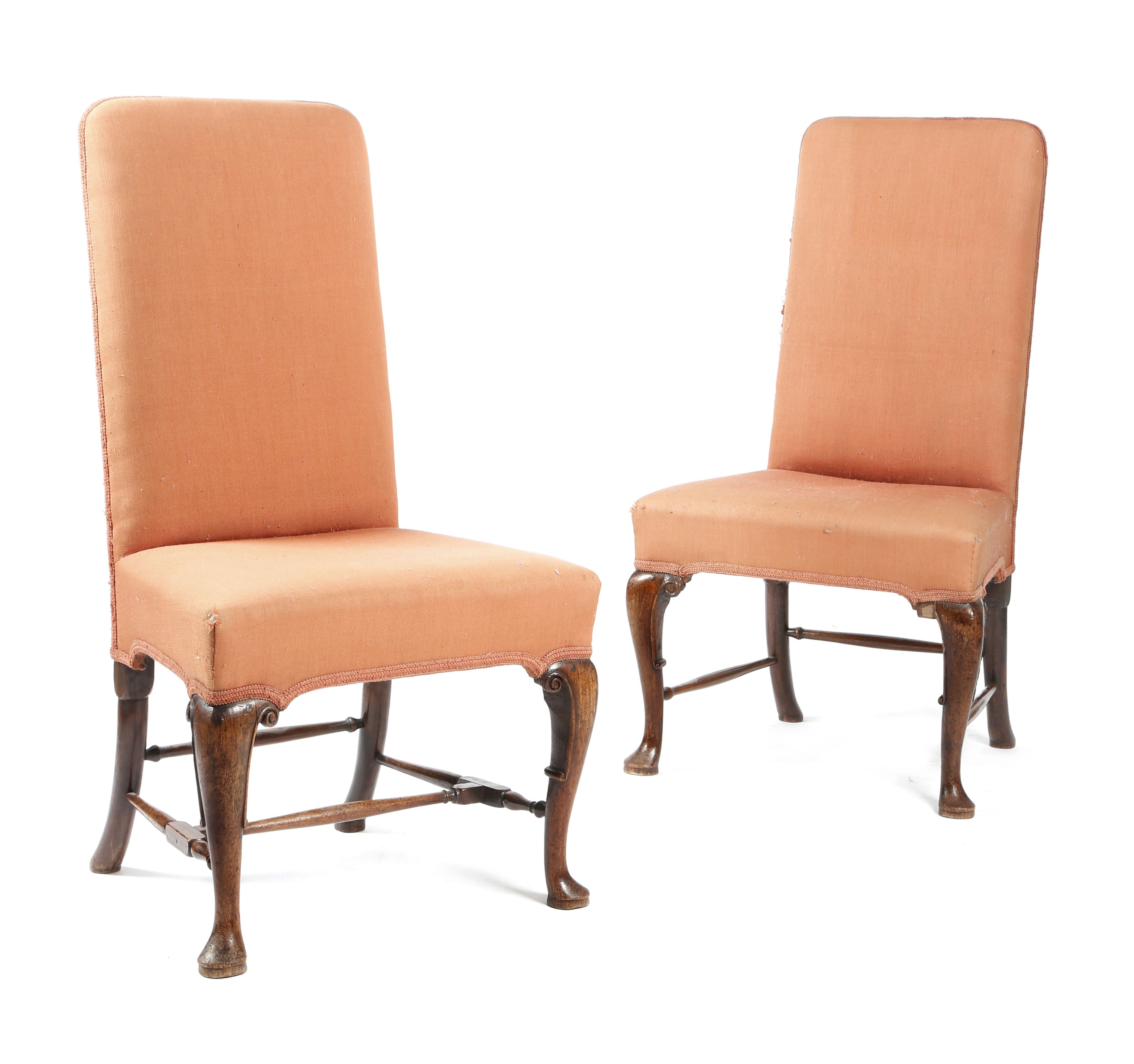 A pair of George II walnut side chairs, each with an arched padded back and seat, on hocked cabriole front legs and pad feet, with differing stretchers. (2)