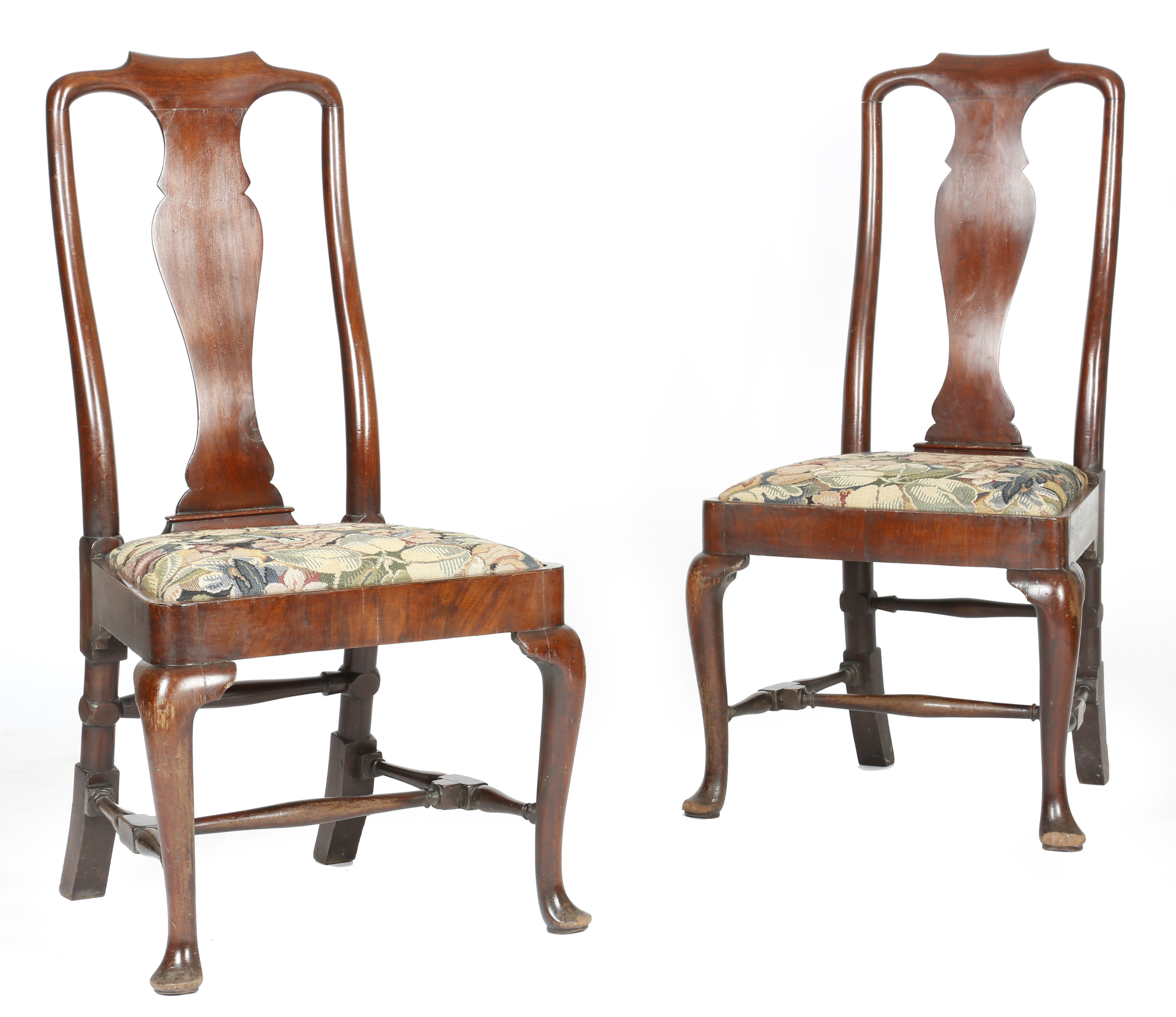 A pair of George II red walnut side chairs, each with a vase shaped splat, above a later tapestry drop-in seat, on cabriole front legs united by baluster and block stretchers. (2)