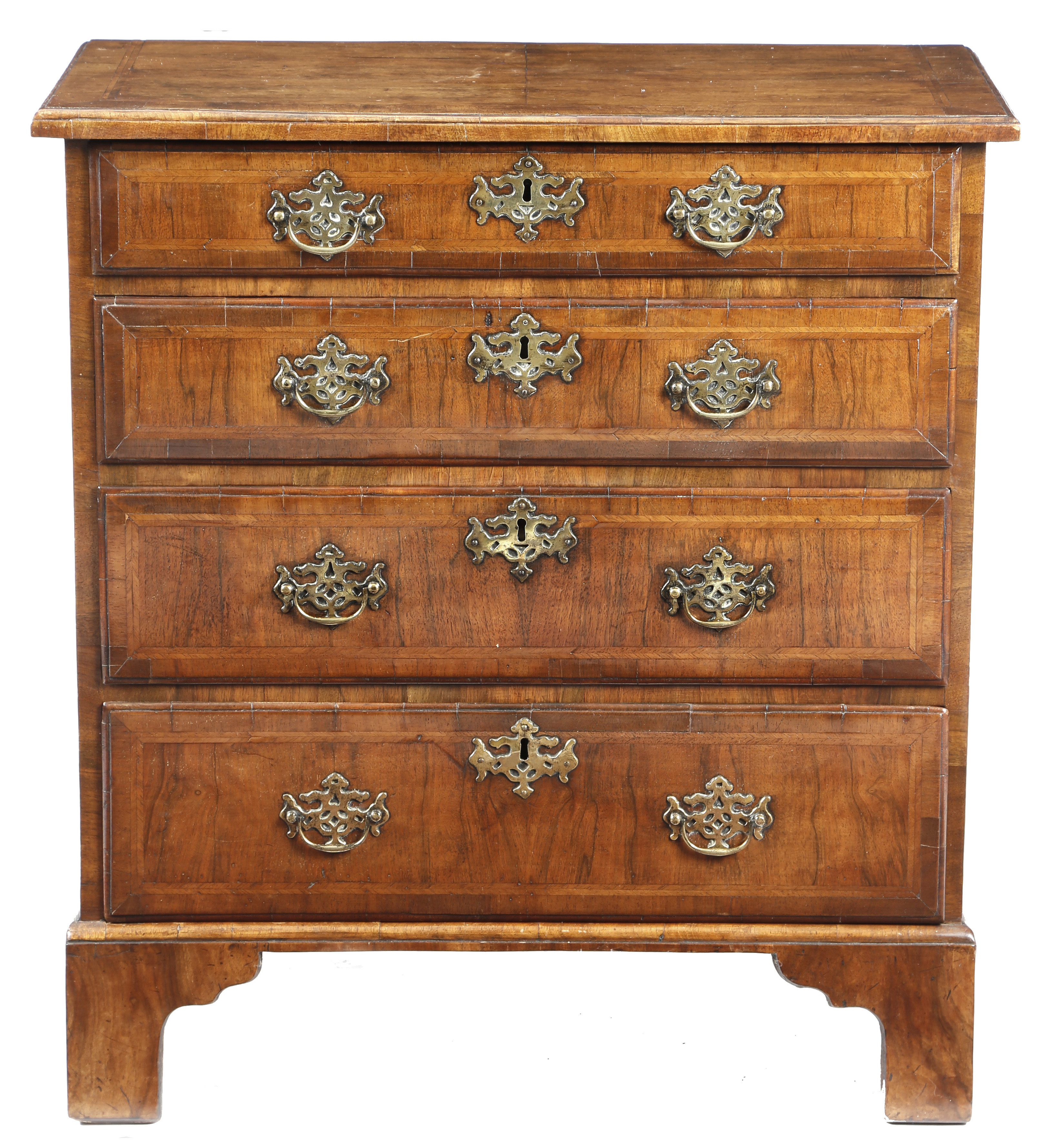 A George II walnut chest, the quarter veneered cross and feather banded top with a moulded edge, above four long graduated drawers, on bracket feet, with oak sides, 81.5cm high, 74.5cm wide, 40.1cm deep.