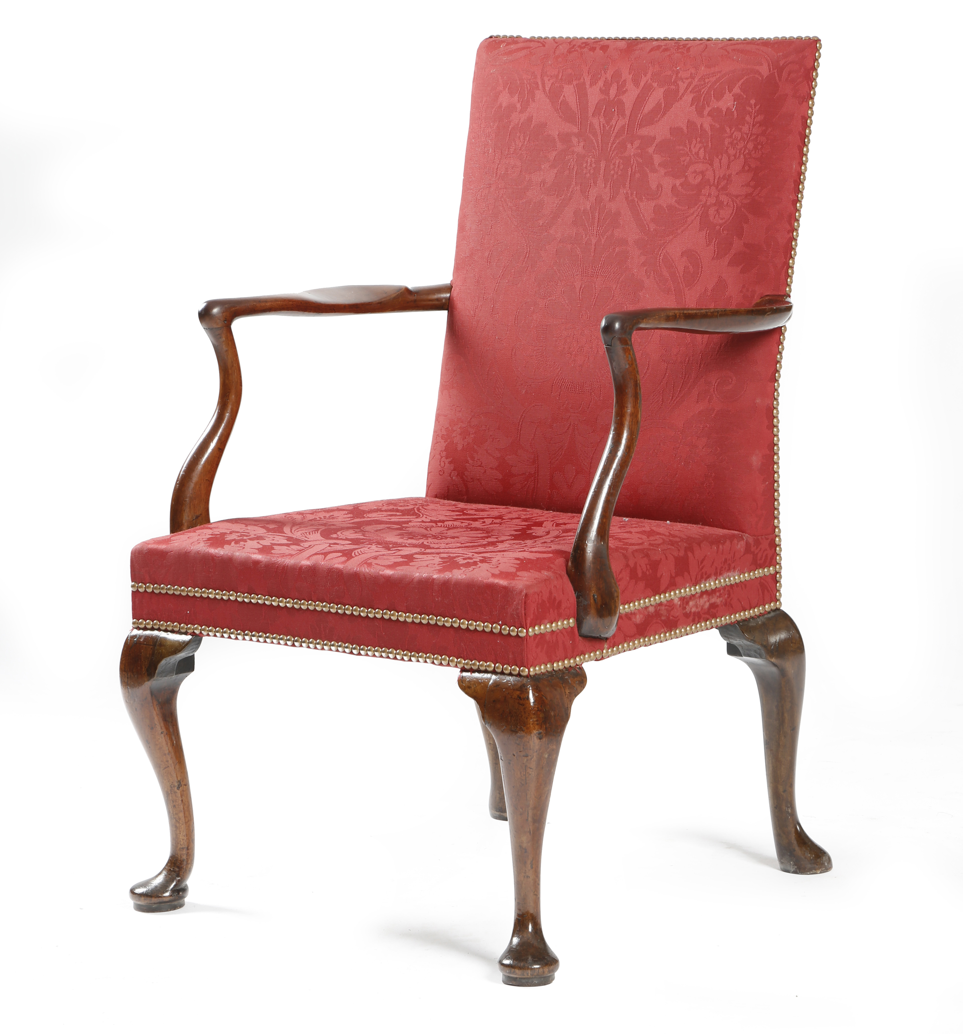 A George II walnut open armchair, the padded back and seat later upholstered with damask fabric, on cabriole legs and pad feet.