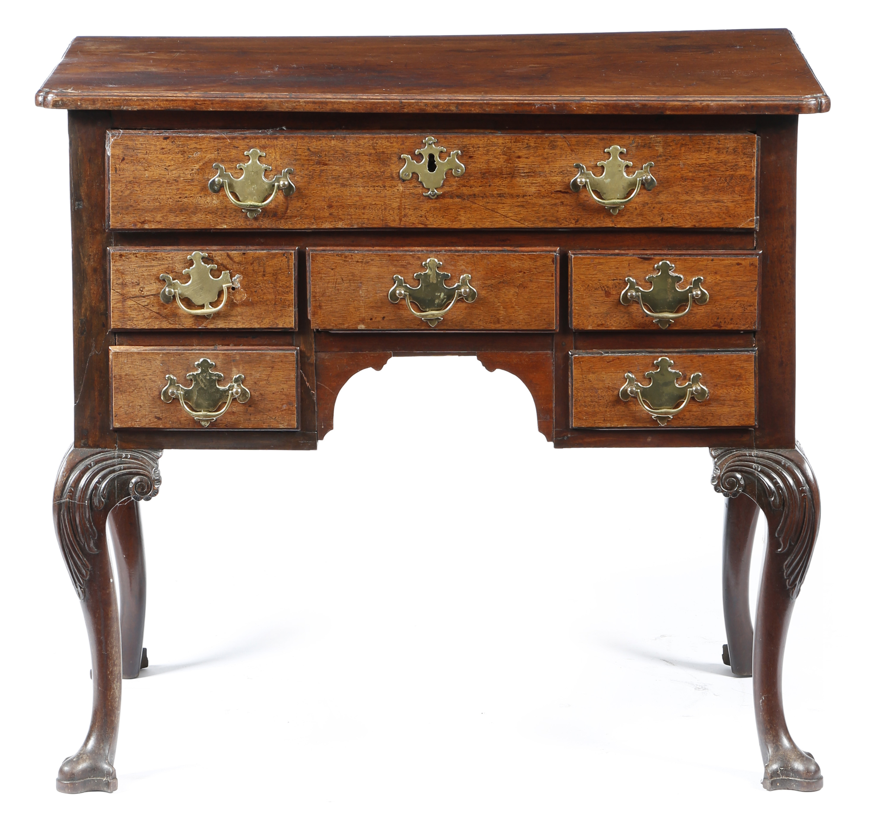 A George II Irish red walnut lowboy, the top with a moulded edge and re-entrant front corners, above an arrangement of six drawers, on leaf scroll carved cabriole legs and trefid feet, 74.8cm high, 81.3cm wide, 51cm deep.