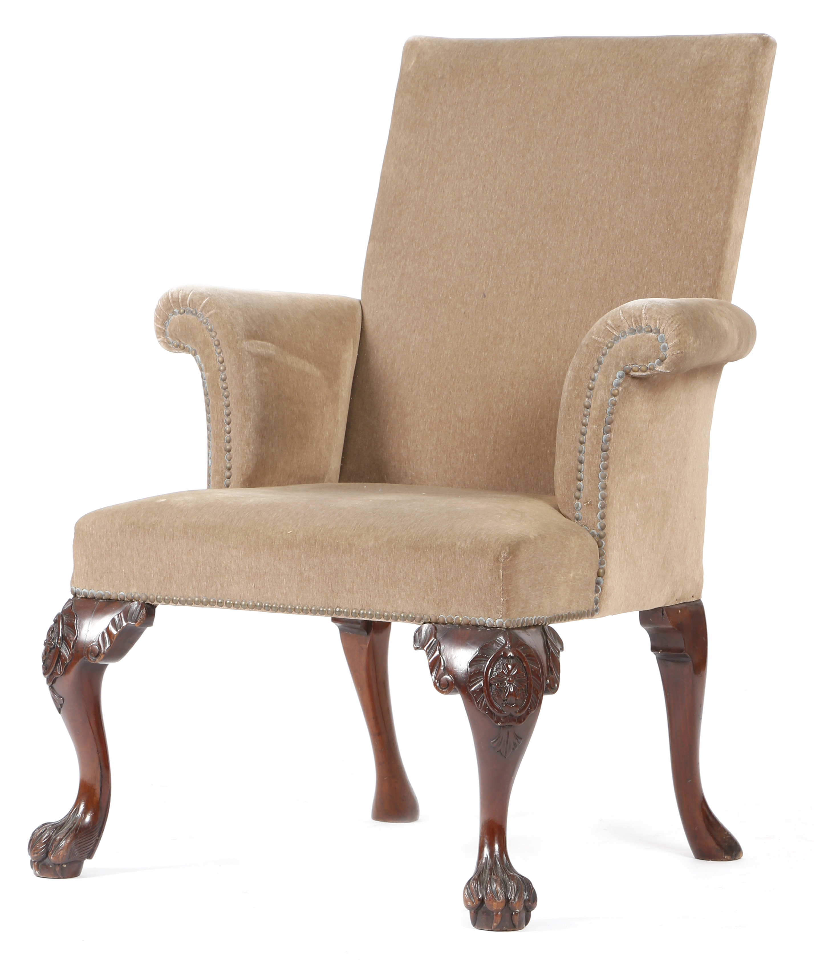 A 19th century Irish mahogany armchair in George II style, with a padded back and seat, on flower cartouche capped and frill carved front cabriole legs and hairy lion's paw feet.
