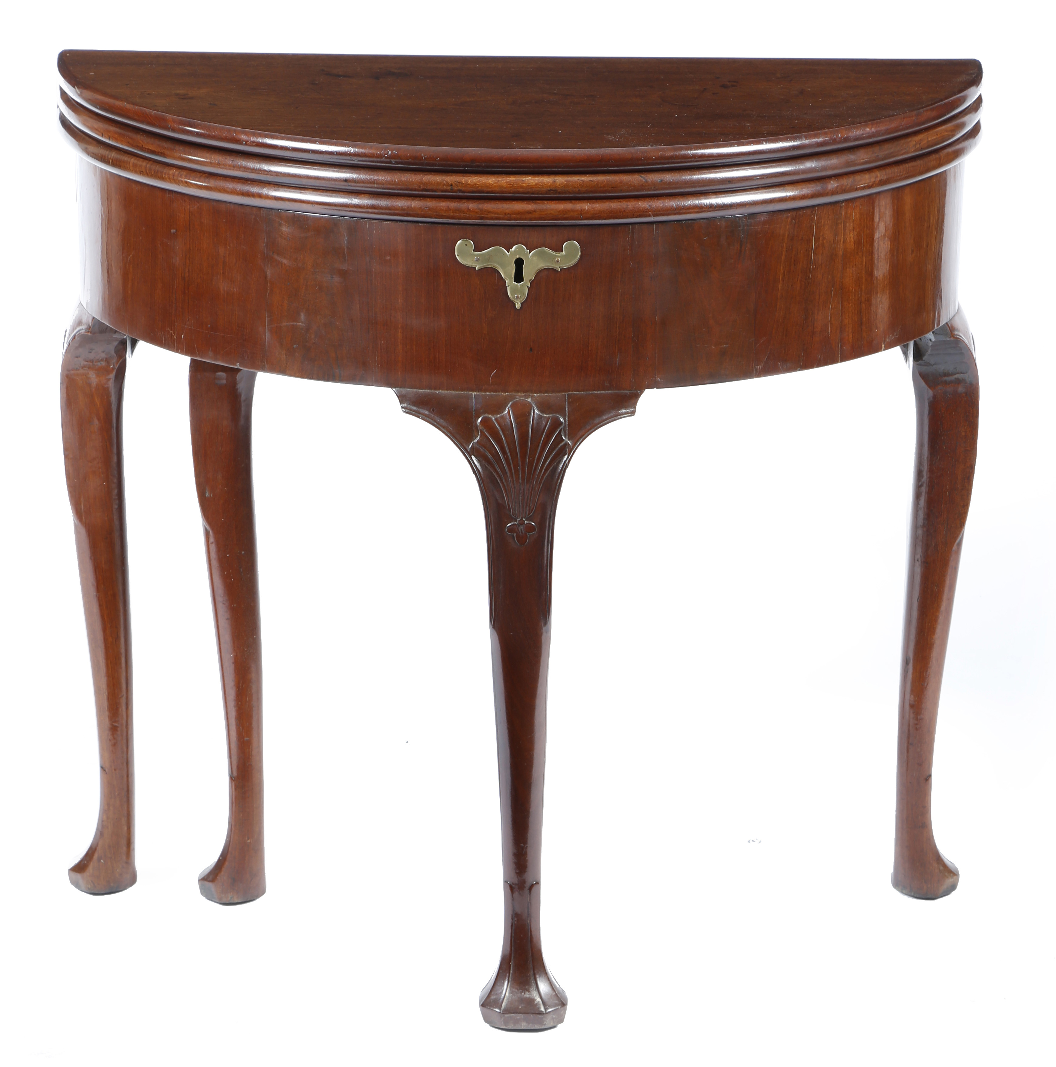 A George II Irish red walnut demi-lune combined games and tea table, the hinged triple top revealing a baize lined surface with sunken counter wells and with a vacant interior flanked by compartments for pen and ink, on a single gate support and shell capped cabriole legs and faceted pad feet, 75.5cm high, 80.5cm wide, 40cm deep.