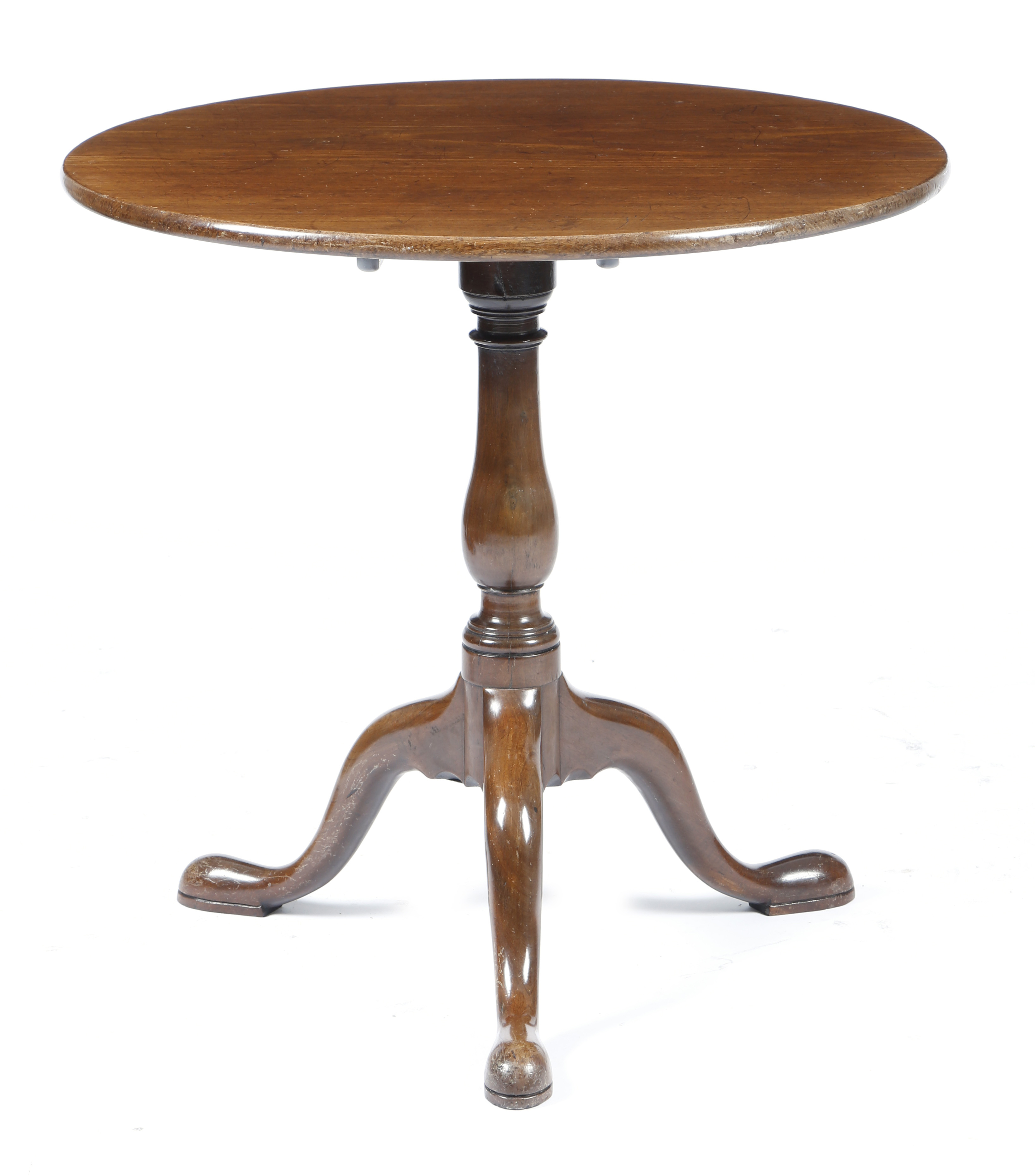 A George III mahogany tripod table, the circular tilt-top on a baluster turned stem, cabriole legs and pad feet, 71cm high, 72.8cm diameter.