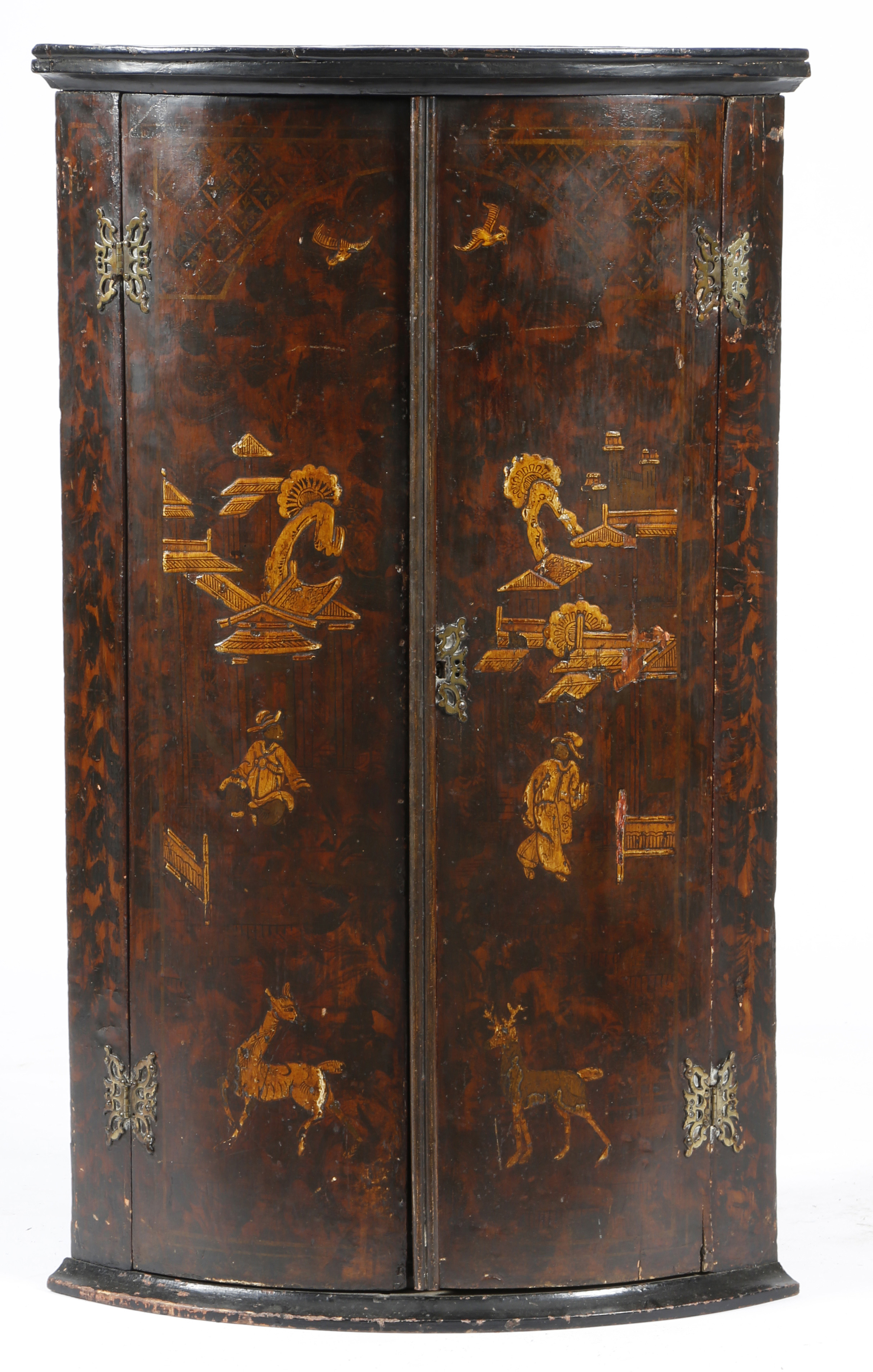 An early 18th century japanned bowfront hanging corner cupboard