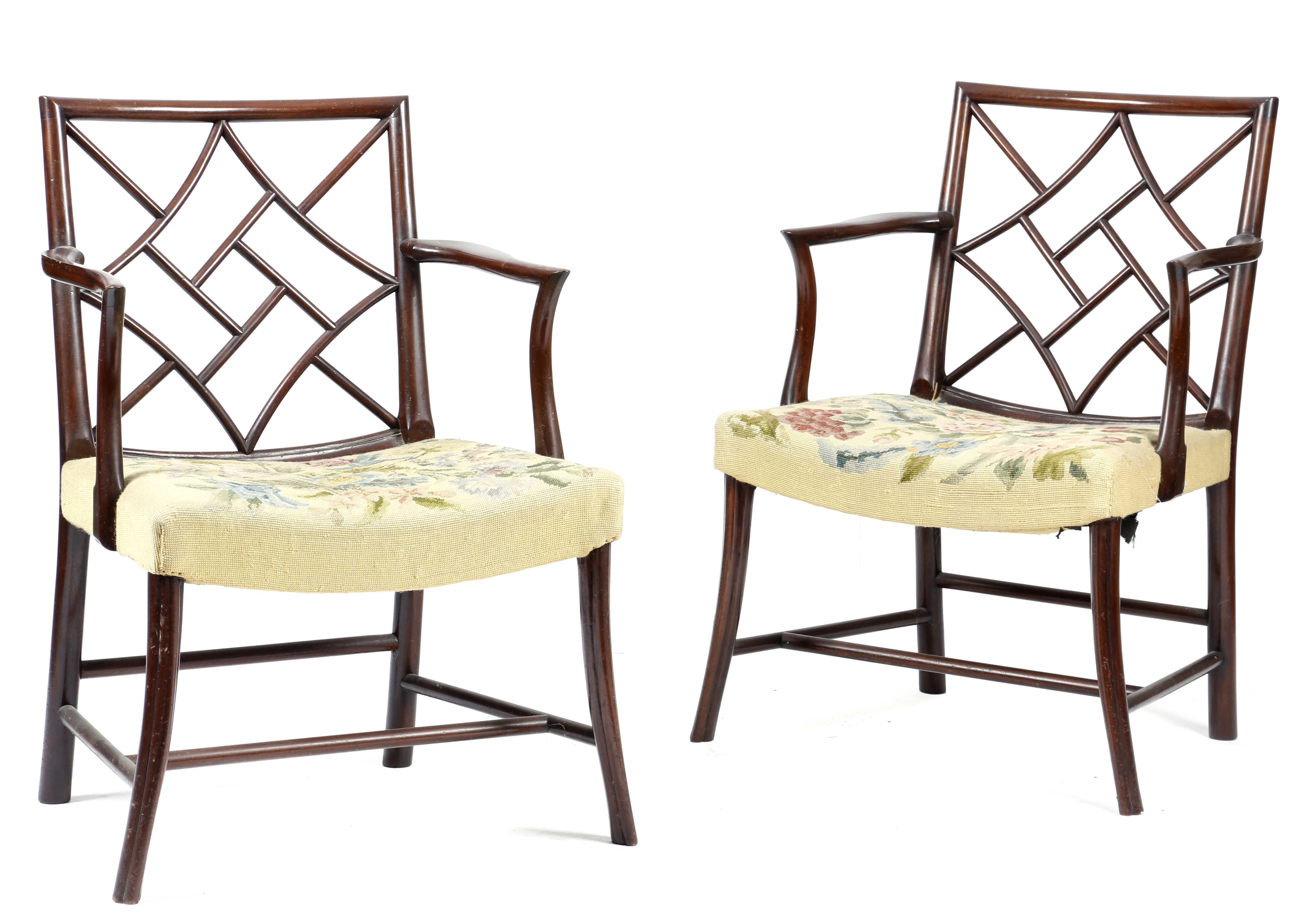 A pair of mahogany cockpen open armchairs in George III style, each with a Chinese style lattice back above a floral needlework seat, one signed to the underside 'Mrs Evershed 8, South Molton Street, London, W1', on swept cluster front legs united by an 'H' stretcher, late 19th /early 20th century. (2)