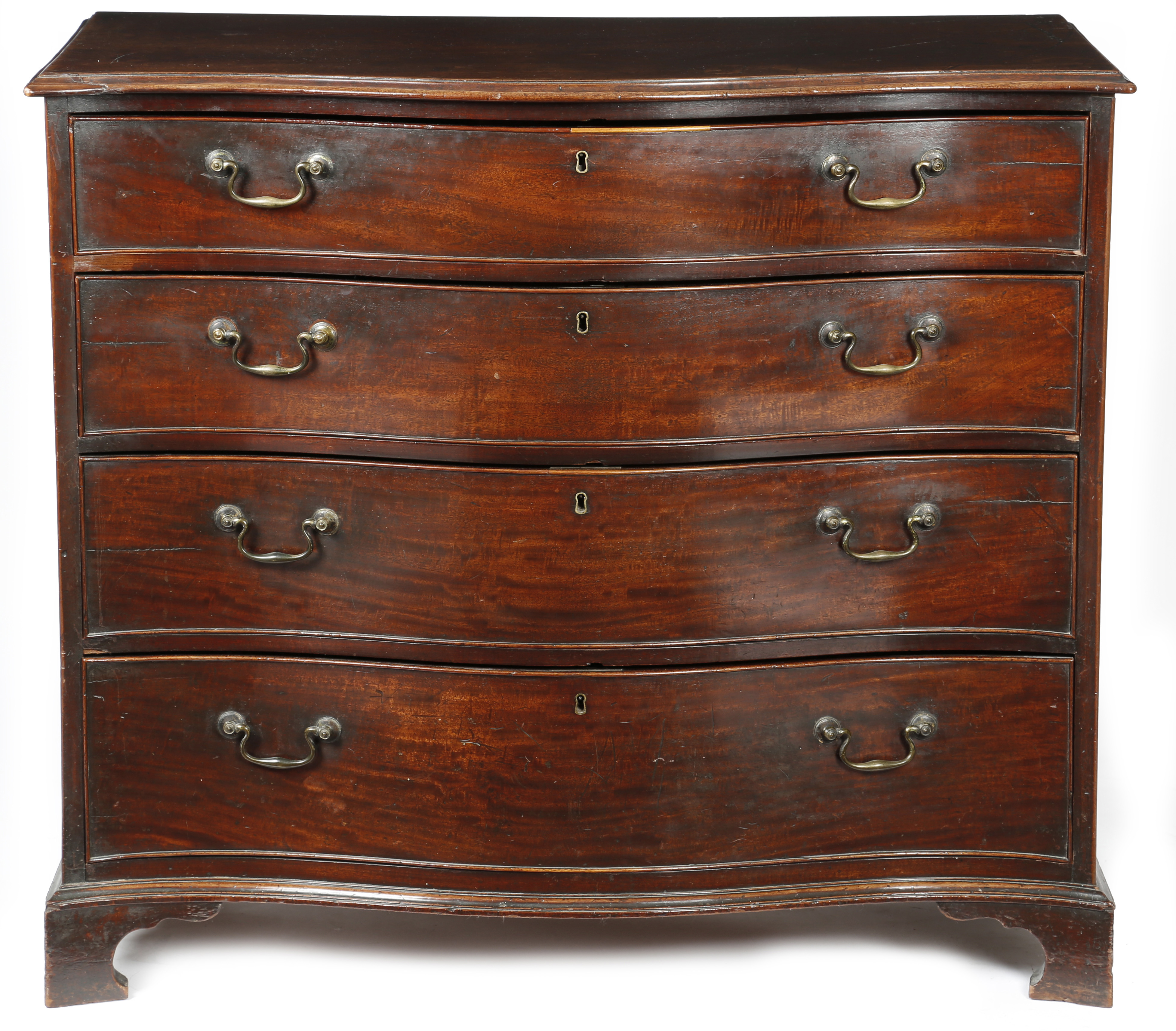 A George III mahogany serpentine chest, the moulded edge top above four long graduated drawers, on shaped bracket feet, 95.8cm high, 109cm wide, 57.8cm deep.