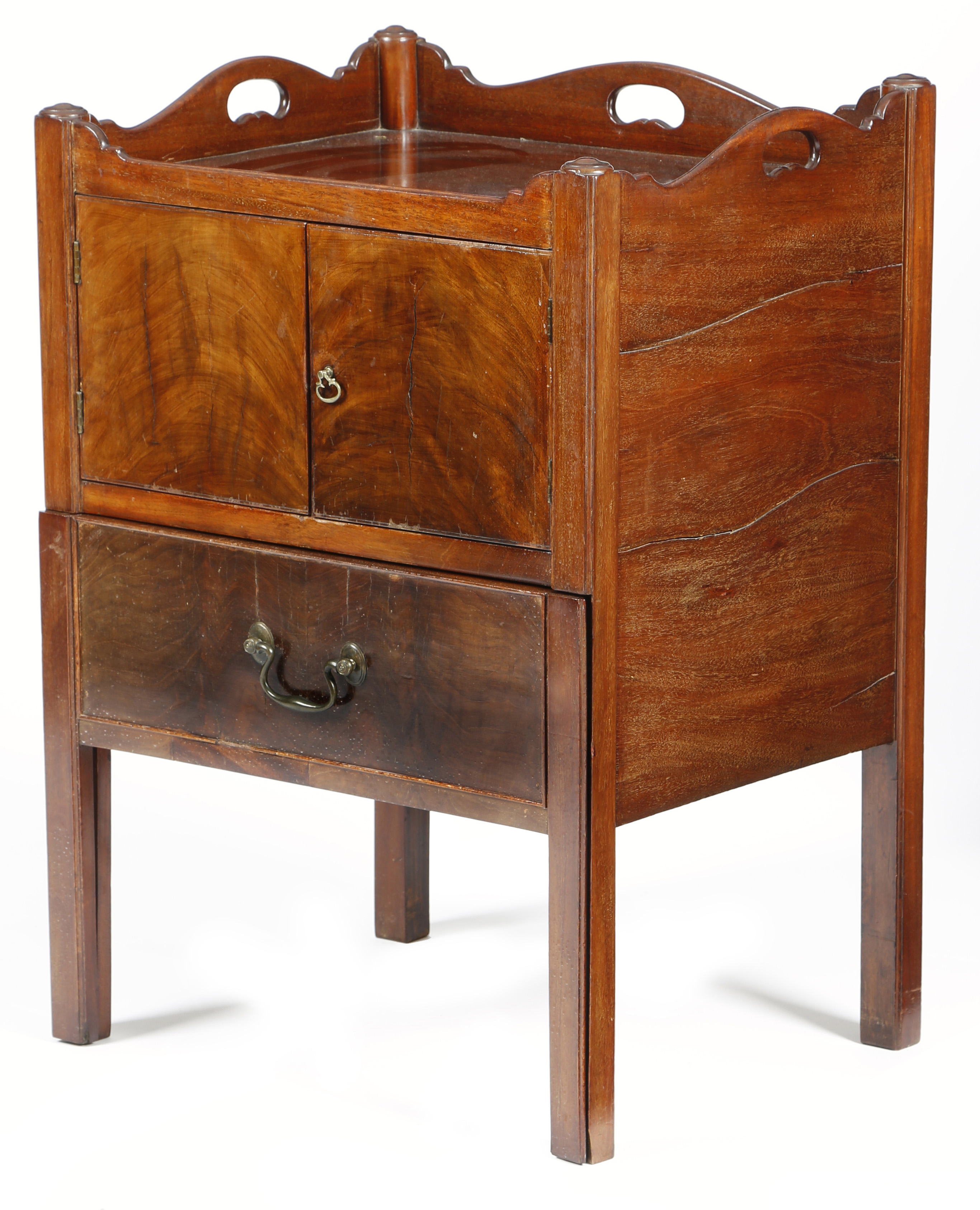 A George III mahogany tray-top bedside commode, the serpentine gallery pierced with three handgrips, above a pair of cupboard doors and a converted leather lined pull-out base, 79.8cm high, 56cm wide, 45.3cm deep.
