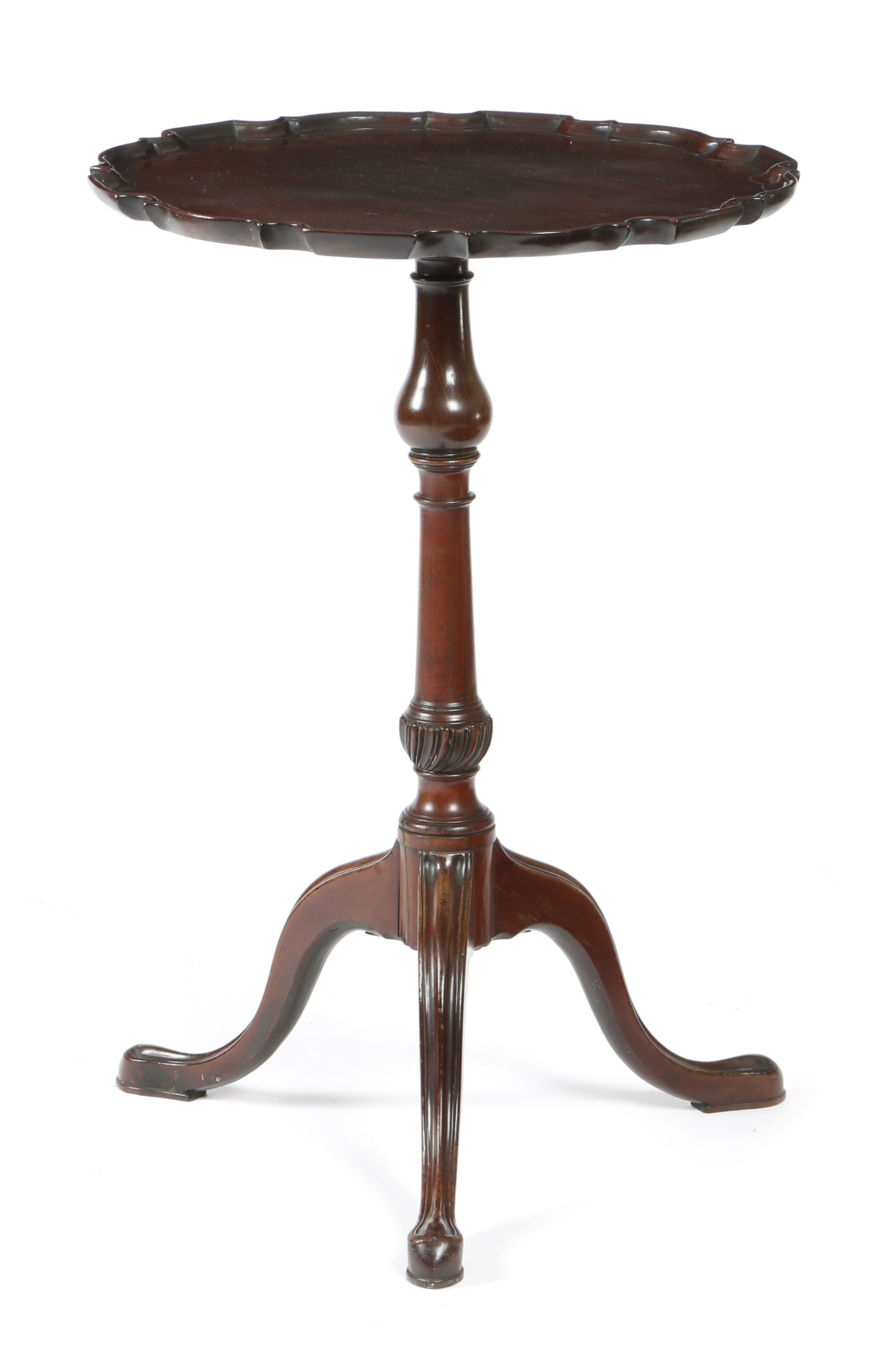 A George III mahogany tripod table, the circular fixed top with a pie-crust moulded edge above a turned part baluster and column stem with a fluted bowl, on moulded legs and pointed pad feet, top and base possibly associated, 72.4cm high, 50.4cm wide.