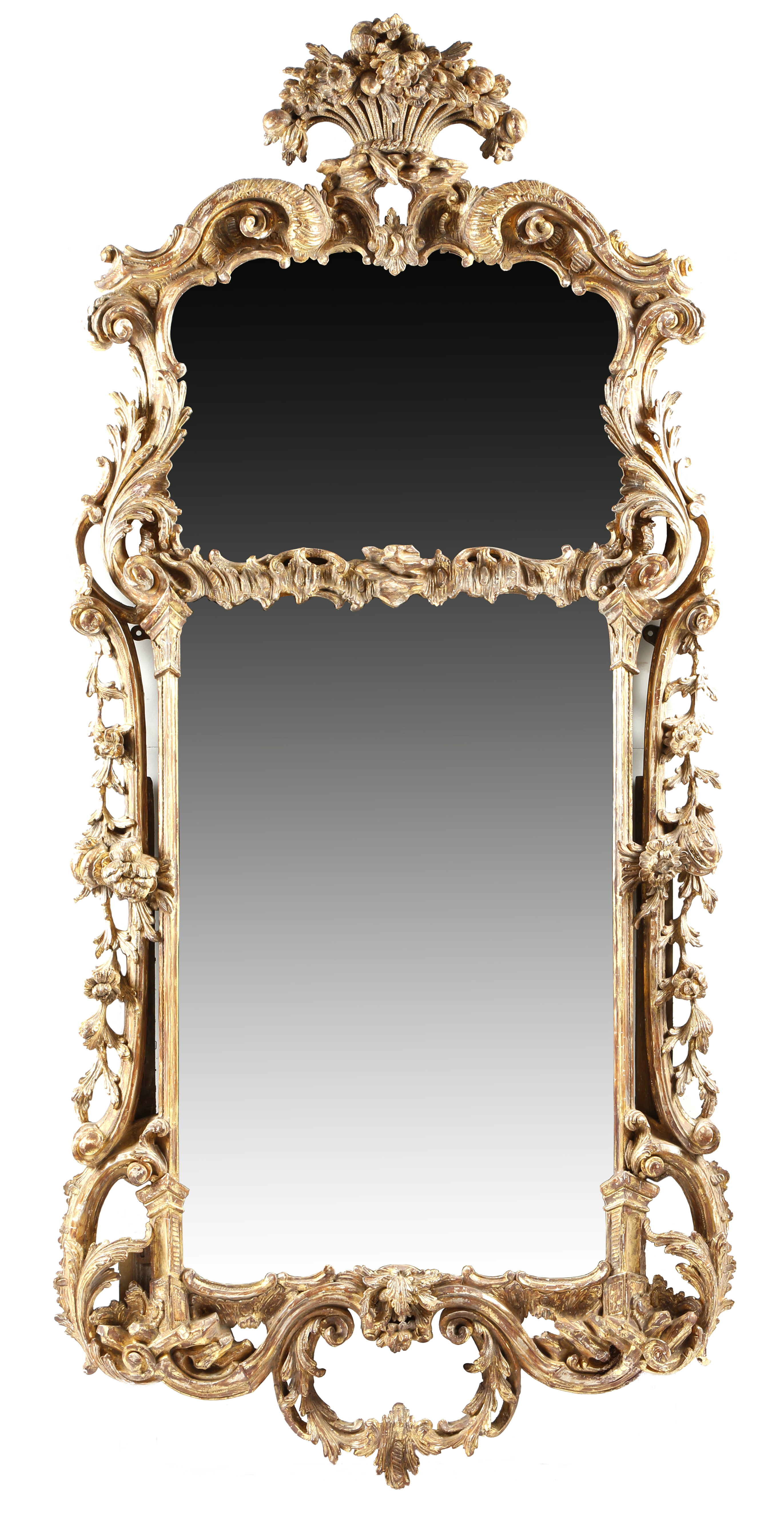 A George III giltwood wall mirror in the manner of John Linnell, with two shaped plates divided by a band of rockwork, the lower flanked by columns, within a rocaille, leaf and scroll carved frame, with a basket of flowers surmount, re-gilt, 188.4 x 89cm.