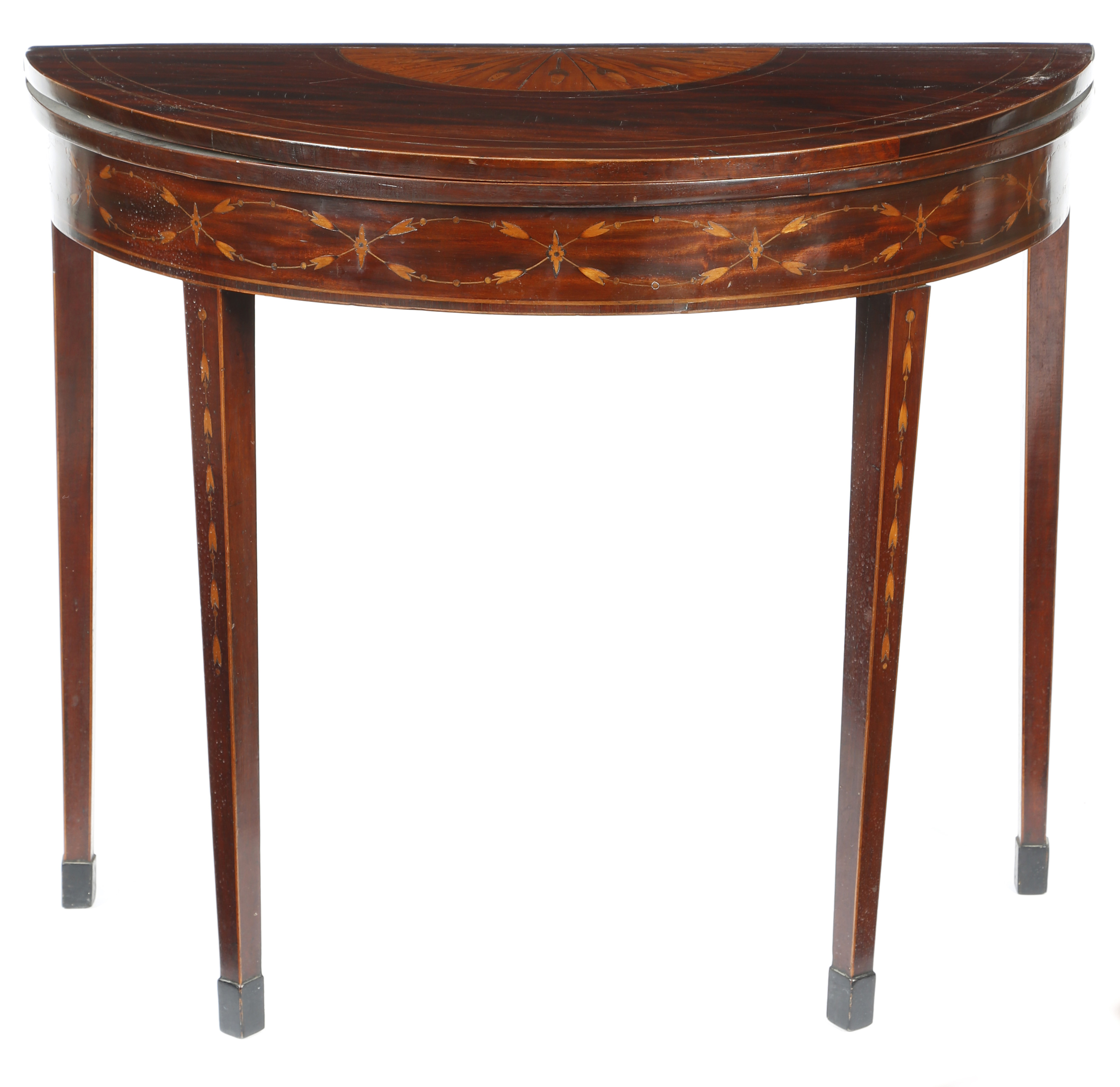 A George III mahogany demi-lune card table, inlaid with stringing, the hinged fold-over top with a satinwood and flower decorated fan, the frieze and legs inlaid with bell flowers, 74.3cm high, 86.7cm wide, 43cm deep.